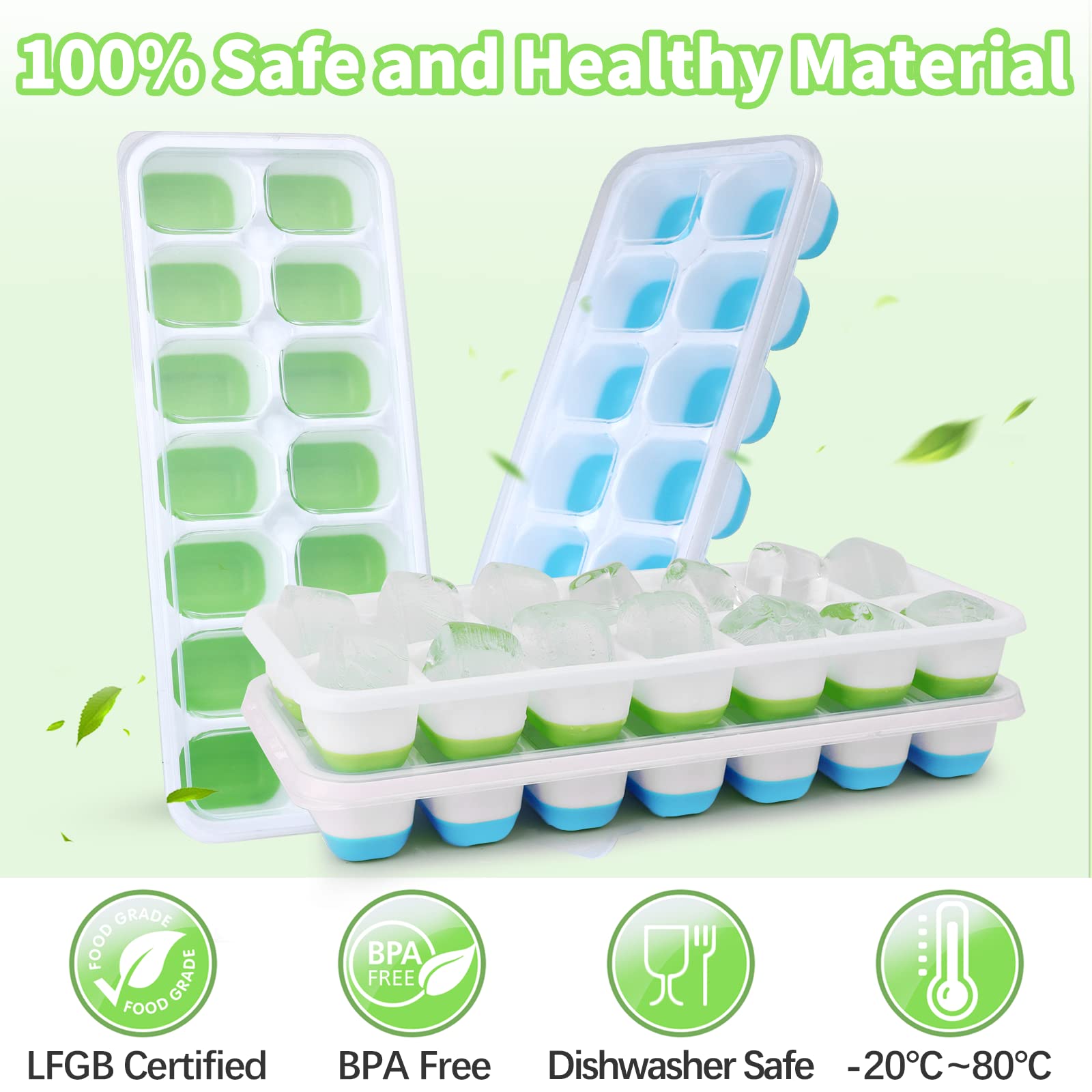 - Effortless to Release: Compared with the previous hard plastic ice trays, this silicone ice cube trays with lid use TPE material and the bottom wider design, which makes it very easy to release ice cubes by pushing the soft bottom. No need for awkward bending or twisting, removing the ice cube isn't a tough job anymore!