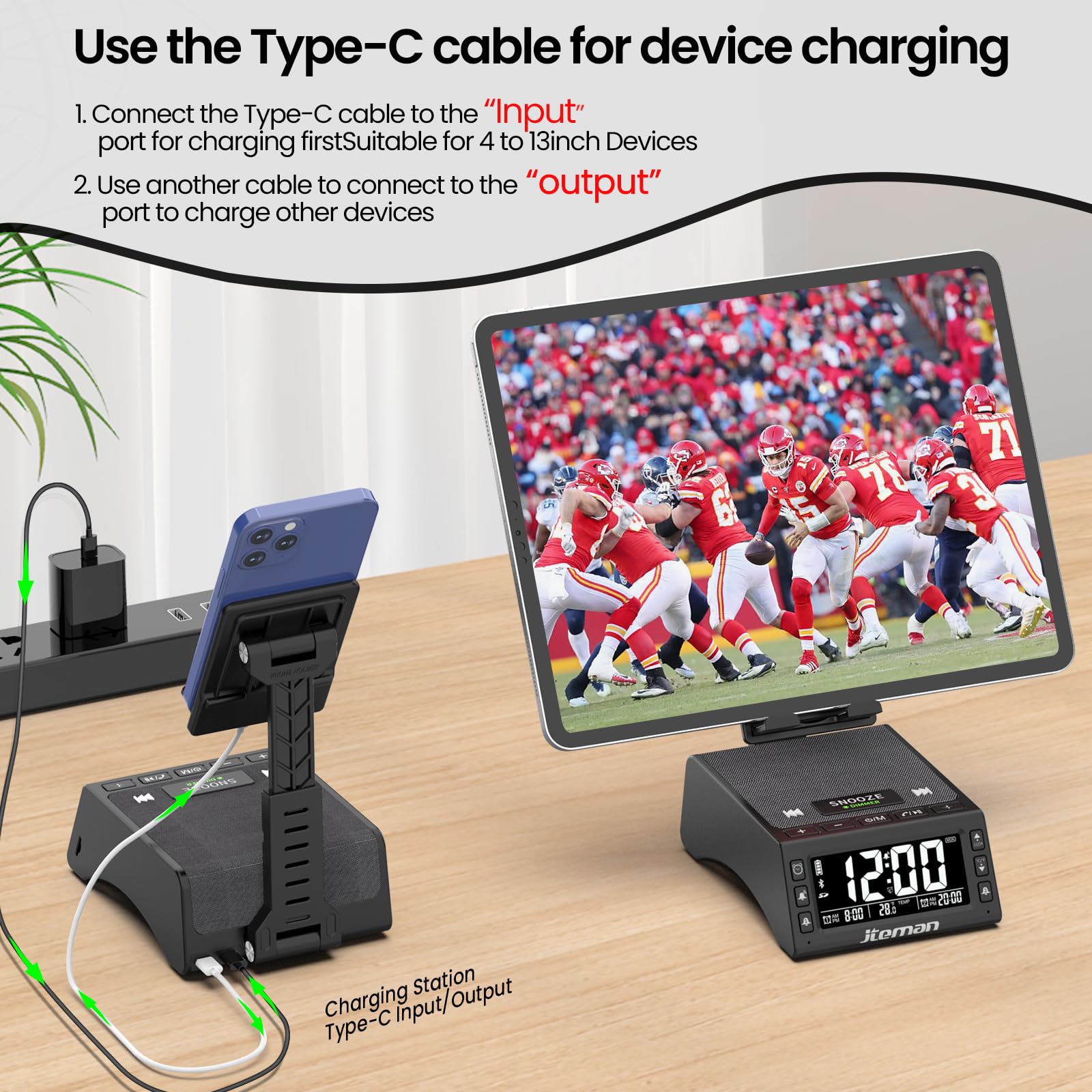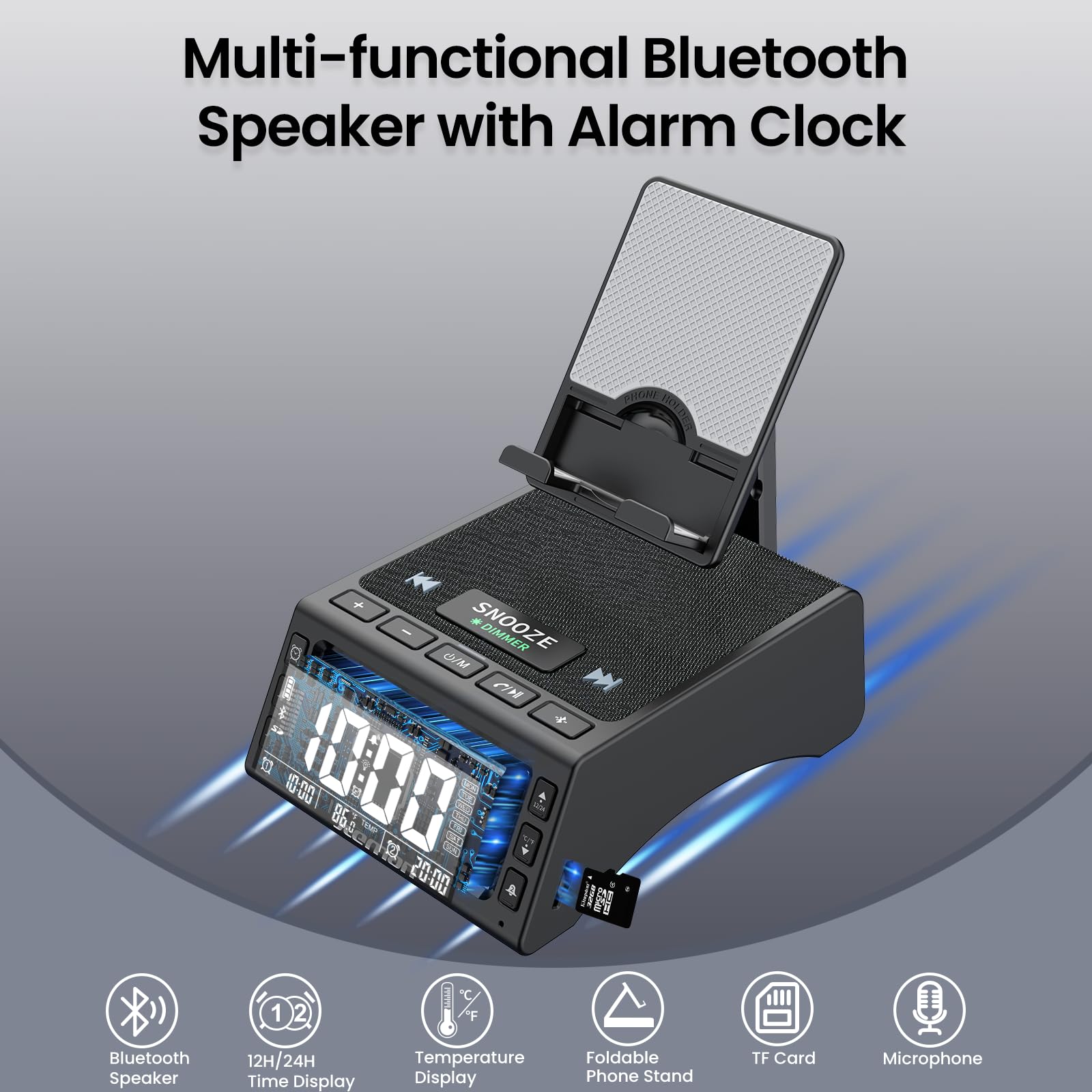 - 【Cell Phone Stand Stable Strong and Adjustable】The phone holder with bluetooth speaker clock is made of high-quality hard raw material injection molding, and reinforced iron blocks are added inside the base, and the all-round anti-slip design makes the base more stable. The bearing capacity is stable, strong and not easy to break. Angle and height can be adjusted, more convenient to operate and watch. Hidden fold design enhances aesthetics while saving space.