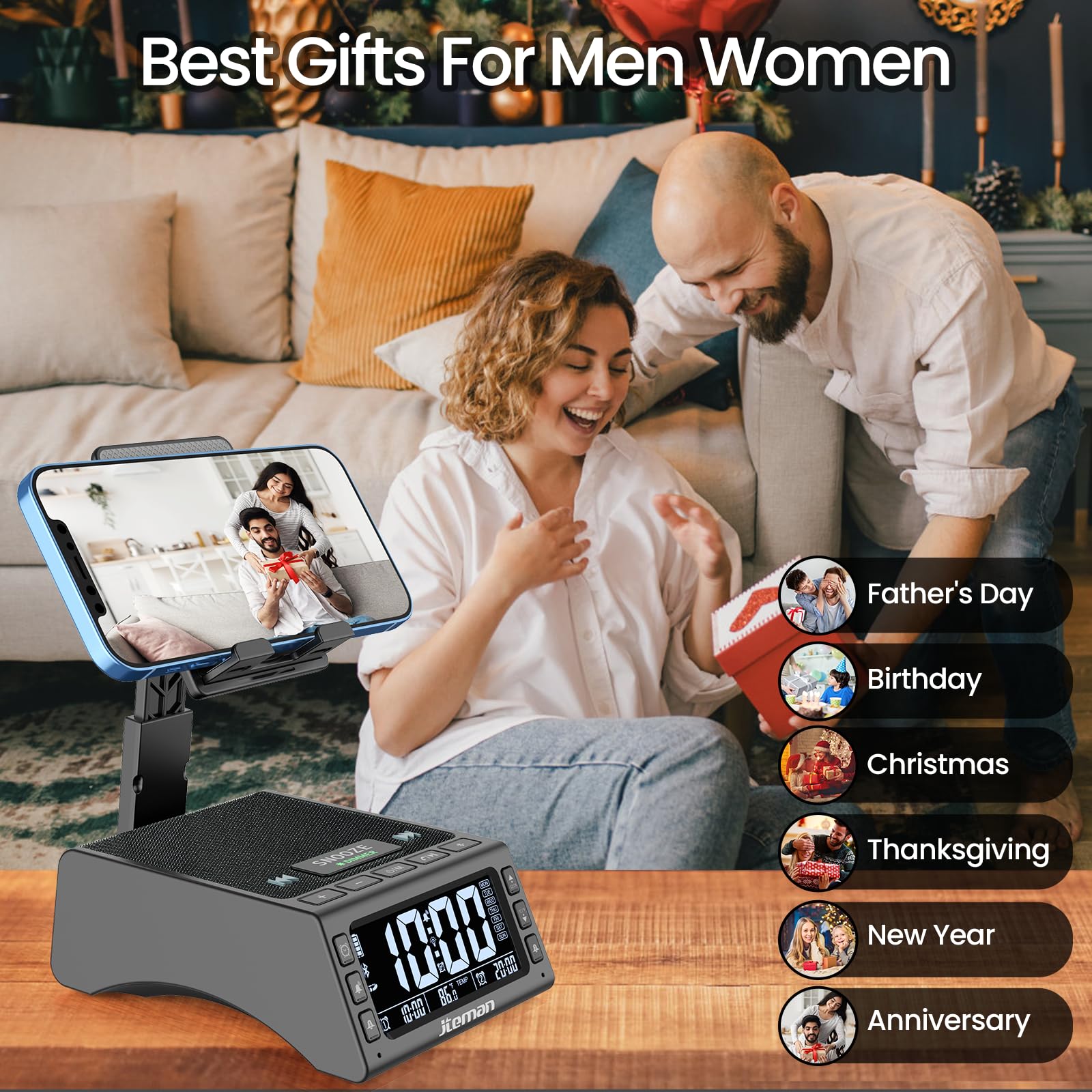 - 【2024 Best Gift Choice】Looking for a gift with an innovative, life-enhancing factor? Look no further than our Bluetooth speaker cell phone stand alarm clock. This versatile tech gift is suitable for men, women, dads, moms, boyfriends, husbands, including grandma, grandpa, and nana. Practical and convenient for listening to music, studying, or working, this kitchen gadget is a must-have. Make special days even more memorable with this speaker that also functions as an alarm clock. Perfect for birthdays, Christmas, Mother's Day, Father's Day, Valentine's Day, Teacher's Day, and more! Surprise your Sister, Best Friend, Girlfriend, Coworker, Wife with this thoughtful and practical gift.