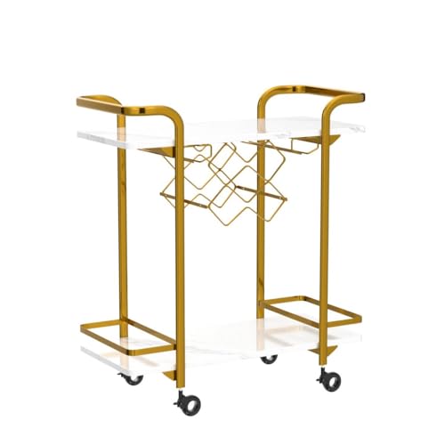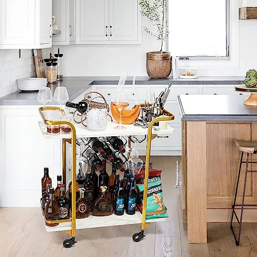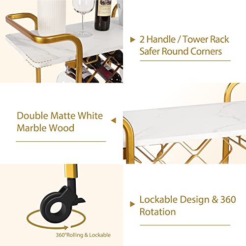 Jubao Deluxe Gold Bar Cart, 2-Tier Premium Texture Bar Cart for Kitchen and Dining Room Outdoor, with Glass Holders and 5 Wine Racks, Modern Marbled Solid Wood Cart on Silent Wheels