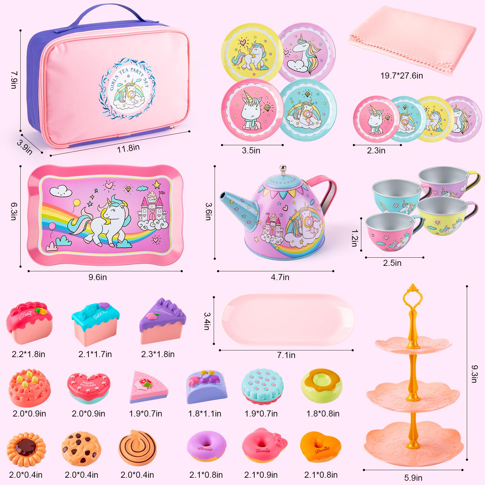 - 🎁GREAT UNICORN GIFT FOR KIDS - Unicorn pretend tin teapot set with cups and plates, colorful play tea dessert accessories and a beautiful tablecloth to create a realistic scene for kids to enjoy a tea party time, this unicorn tea party set is perfect for birthdays, Christmas, New Year, or any special occasion.