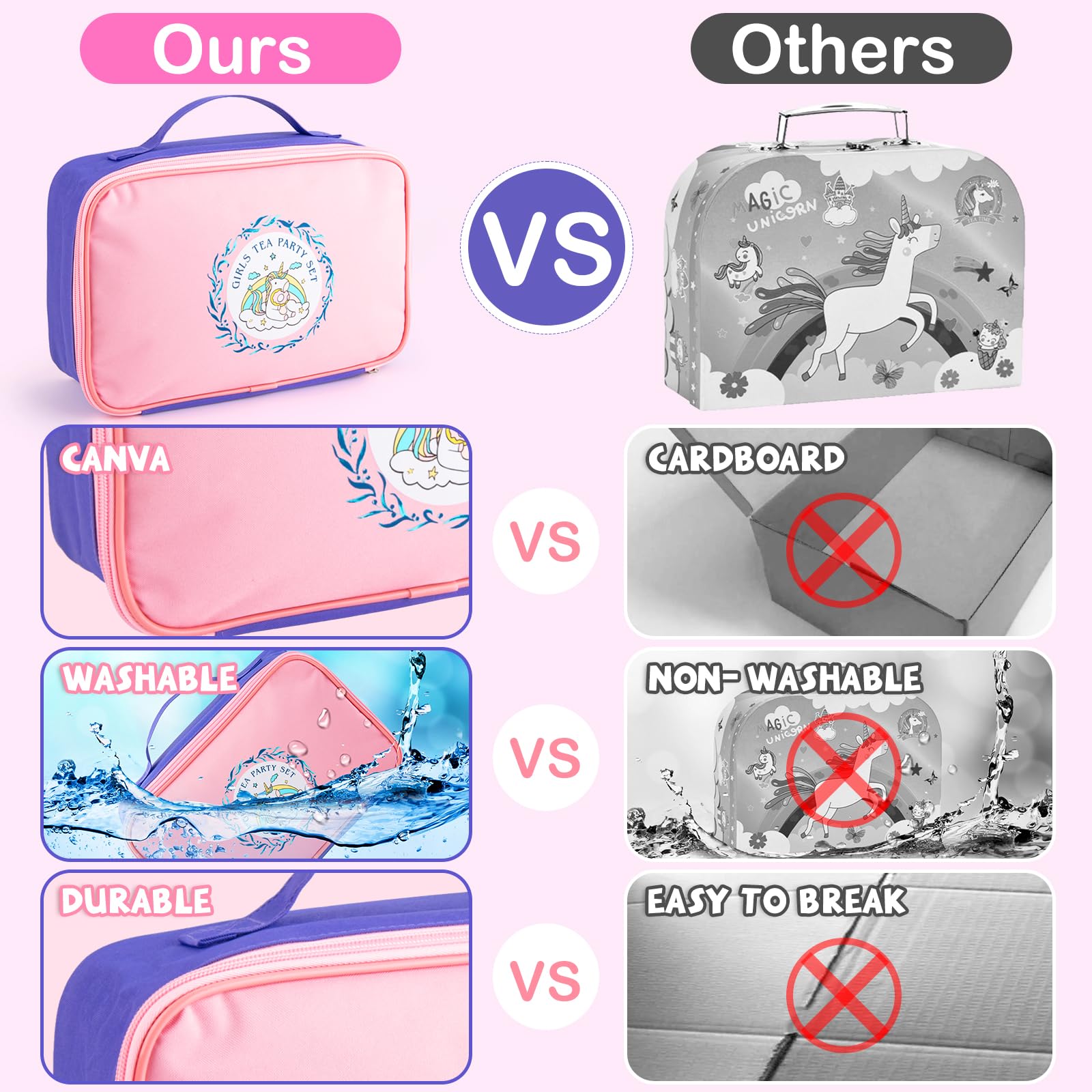 - 💕PREMIUM QUALITY - Our toddler tea set is made of safe and environment-friendly materials. BPA and lead-free, tested to be safe for kids. Compared with traditional cardboard carrying box, the upgrade carrying case uses extremely durable and washable canvas material that will last for years no matter how many times you use it, making things easy to store and carry.