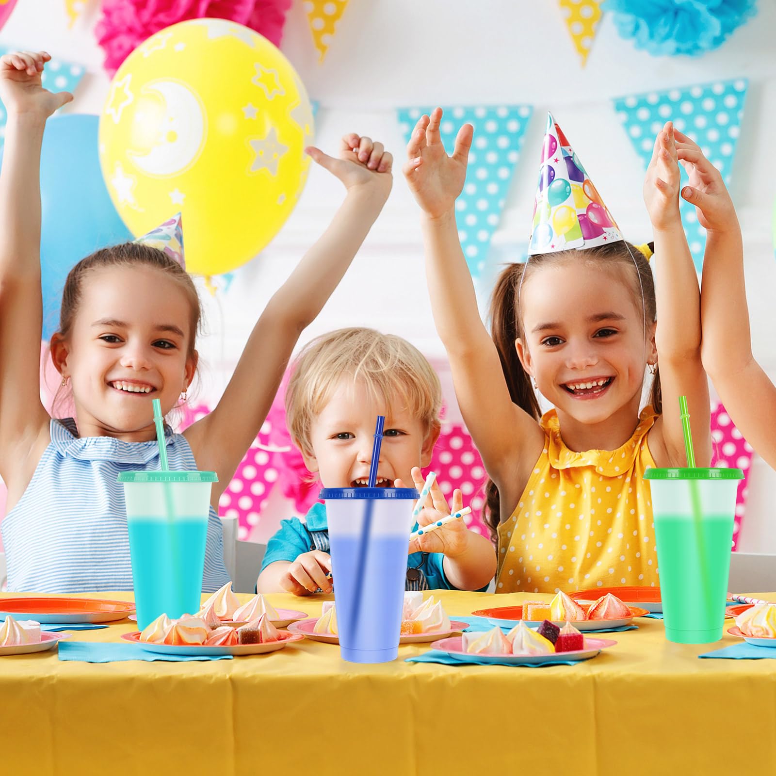 - MUST-HAVE ITEMS FOR PARTIES: Color-changing cups with lids and straws are great for party favors, BBQ, home use, wedding functions, and picnics; the reusable plastic cups tumblers are compact, lightweight, and stackable, unbreakable, and meet all your comfort needs while partying. In addition, the Reusable drinking cup turns into bright colors when filled with ice water that your kids will love, it will make your friends gather an abundance of fun.