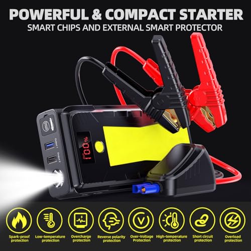 - 【LCD Display & Ultra Bright LED Light】Jumper cable with LCD screen to show remaining power and LED light with 500-lumen bulbs and three modes. Ideal for emergencies, outdoor adventures, and accidents to increase safety.