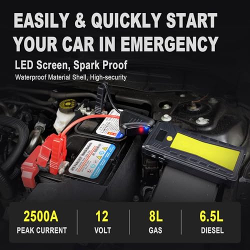 - 【Versatile & Actual Battery Capacity】 This car jump starter is a must-have for car owners and outdoor enthusiasts. With 2500A peak current and advanced QDSP technology, it can start vehicles with engines up to 8.0L gas or 6.5L diesel. It also functions as a power bank and flashlight, making it a versatile and essential tool for any emergencies.