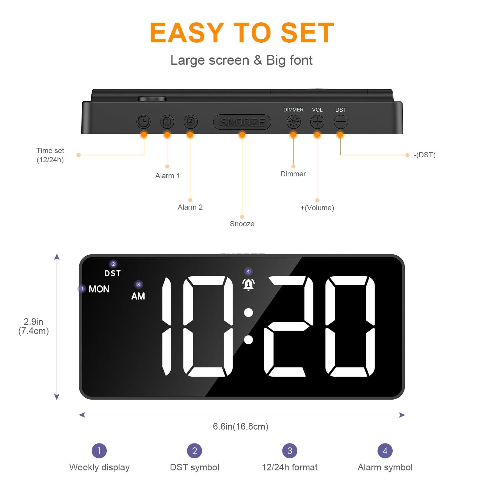 - Clear Display & Multi-Functionality: Witness the time in clarity with our large 7-inch display screen digital alarm clock, showcasing not only the time (in both 12 and 24-hour formats) but also the day of the week. Press the DST button to toggle between standard time and daylight saving time (DST), while enjoying the convenience of dual alarms and a low battery indicator function.