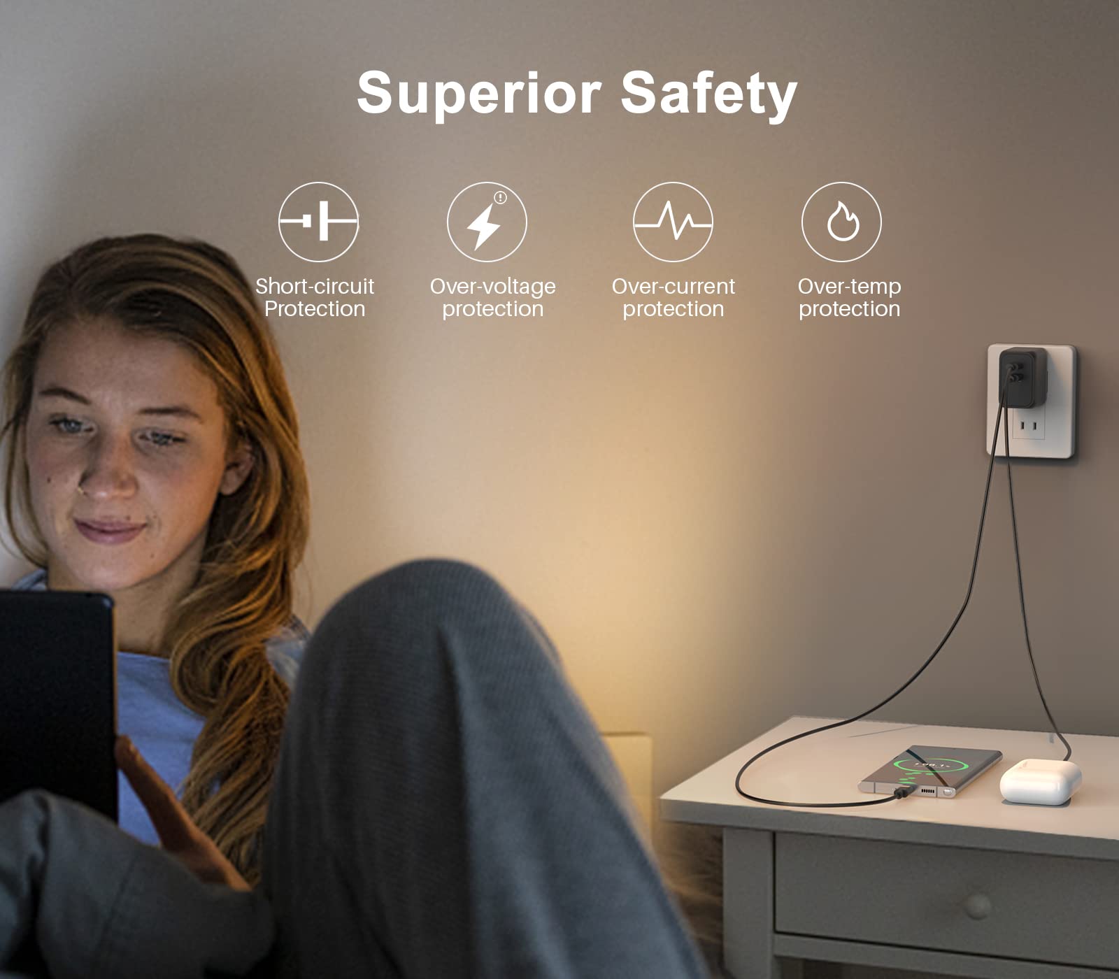 - Safe and Reliable - This GaN 45w charger adopting intelligent power allocation to safely charge your devices. Multiple-functional protections protect your devices from over-current, over-voltage, over-heating, and short-circuiting.