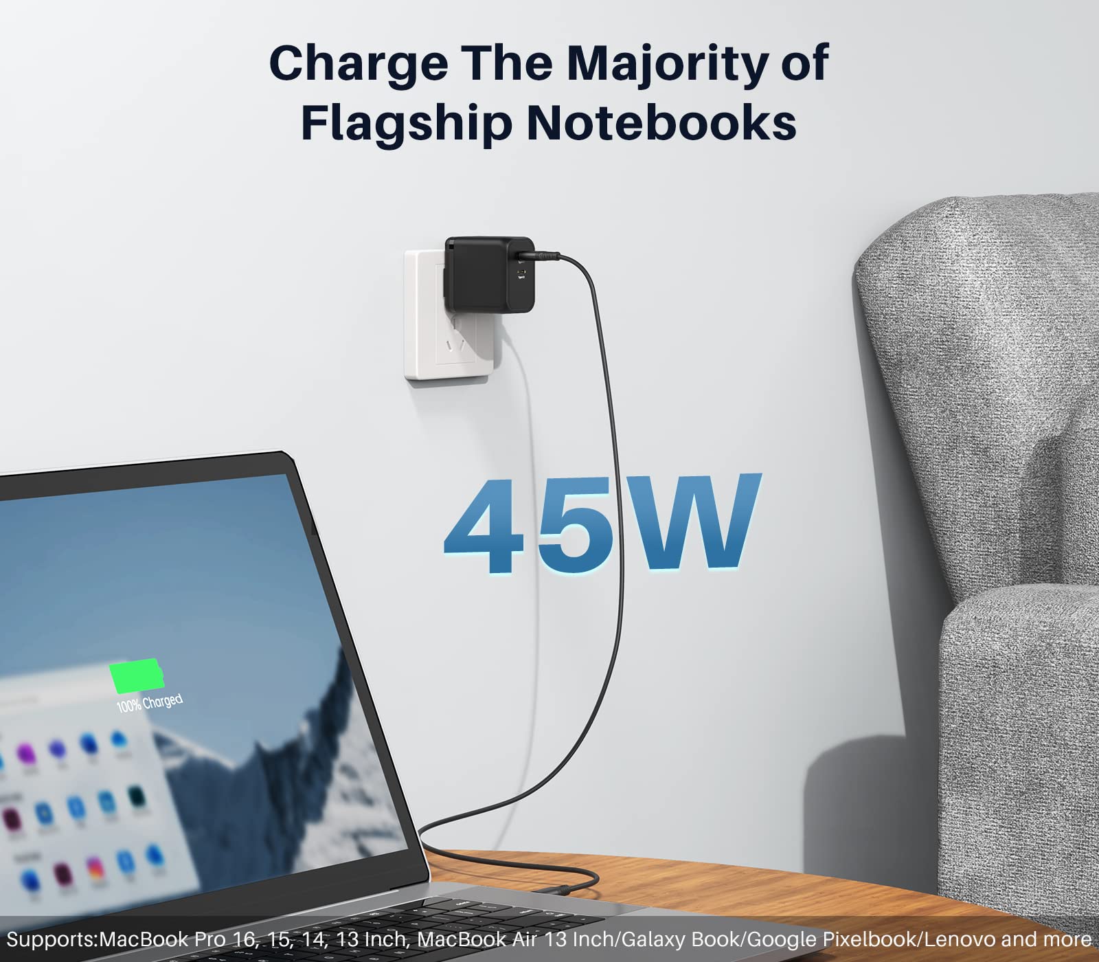 - 45W Fast Charger - The USB C charger can deliver a quick charge with up to 45W for virtually all your mobile devices. It offers fast and efficient power to your smartphones, headsets, laptops and more.