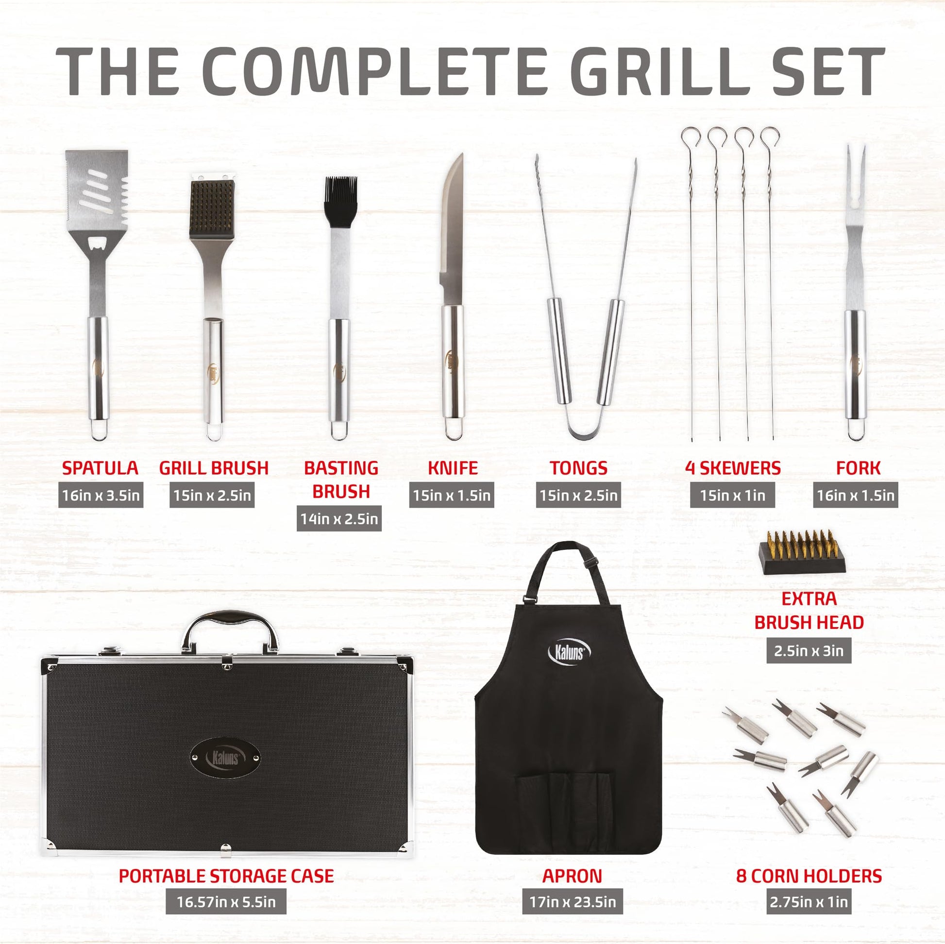 Kaluns BBQ Grilling Accessories, Grilling Gifts for Men Dad, Grill Tools for Outdoor Grill, Heavy Duty Stainless Steel Grill Set with Aluminum Case and Apron, Christmas BBQ Gifts for Men, Women