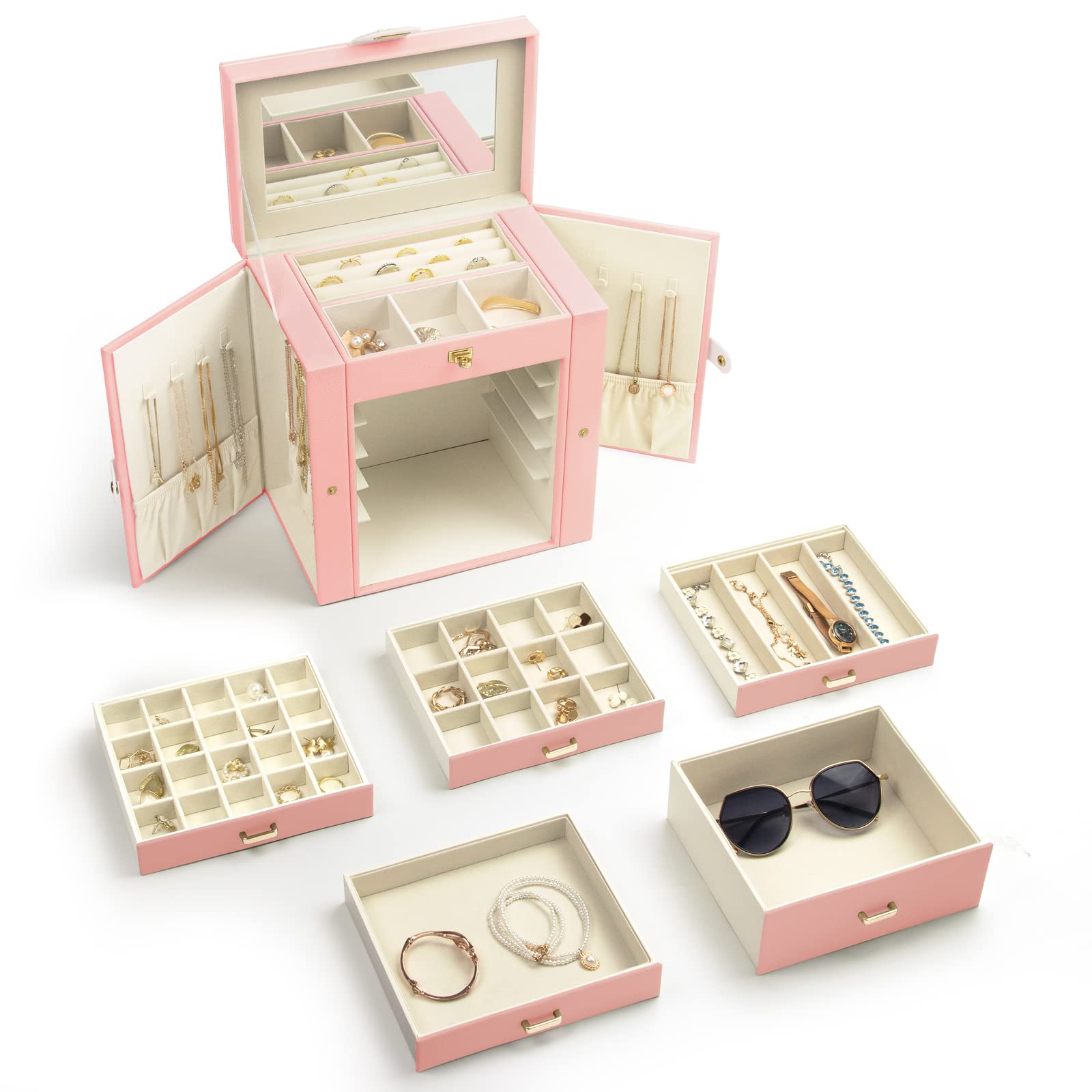 KAMIER Jewelry Box for Women, 6-Layer Large Jewelry Organizer Box with Mirror & 5 Drawers for Rings, Earrings, Necklaces, Bracelets,Pink