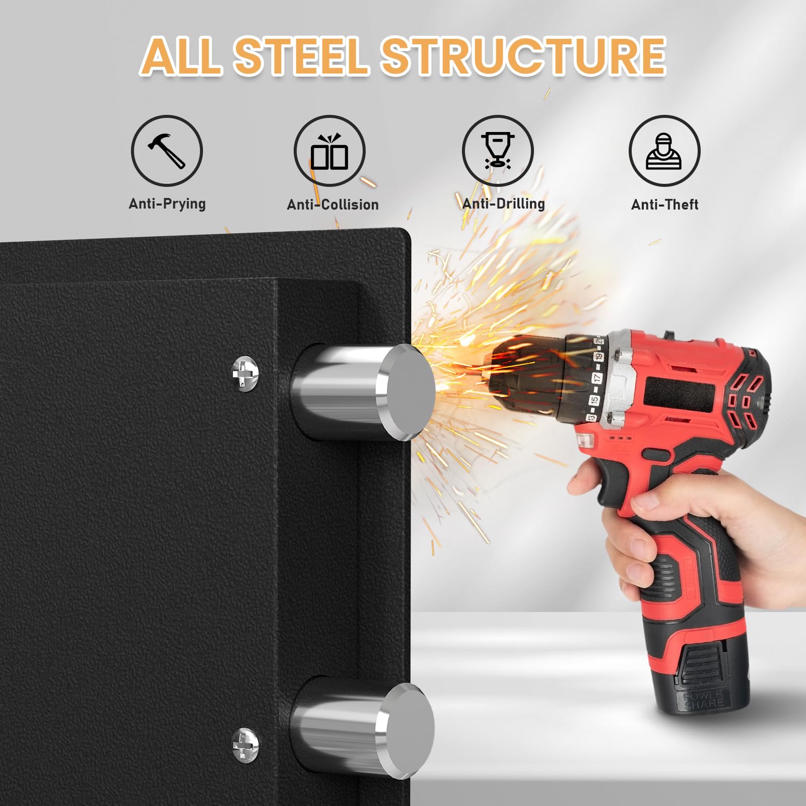 - š„KARBEEN SAFE BOX: Karbeen safe is made of solid cold rolled steel, which has an excellent anti-drilling, anti-smashing and temperature resistance performance, the scratch & stain resistant powder coat protects the safe box from rust and damage. Equipped 2 x 20mm solid locking bolts to provide more secure protection for your property. The upgraded all wrapped edge process is more smashing resistant than ordinary integrated safe boxes.