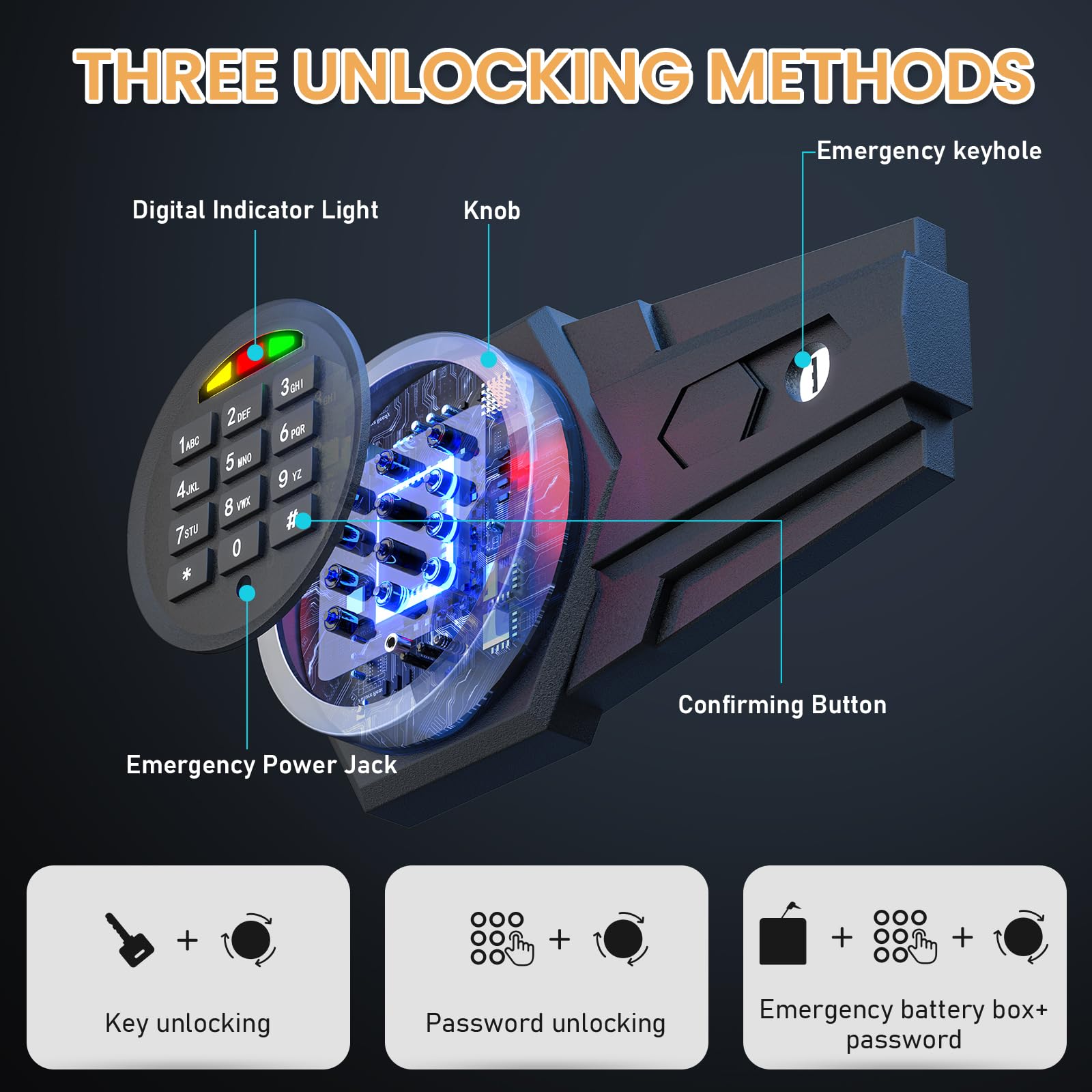- š„ANTI-THEFT LOCKING SYSTEM: If you enter incorrect code for 3 consecutive times, the system will be locked, the keypad would be disabled to prevent all illegal entry. At this time, only the emergency key can be used to open the safe.