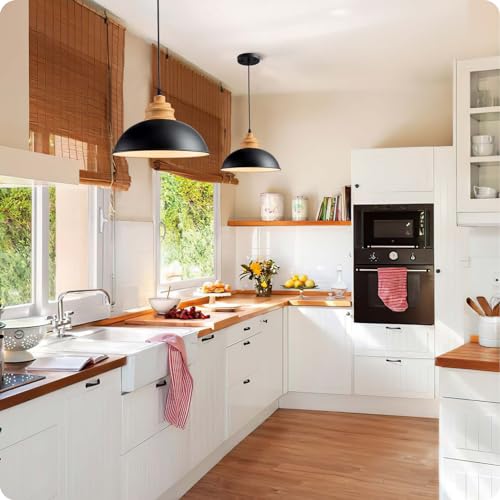 - 【Modern And Stylish Design】Karjearl's black pendant lights kitchen island consists of a matte black metal dome and a wood pattern iron holder, creating a stylish and modern pendant light. The dome shade of the industrial pendant light directs the light downward, and the interior is painted white for brighter light.