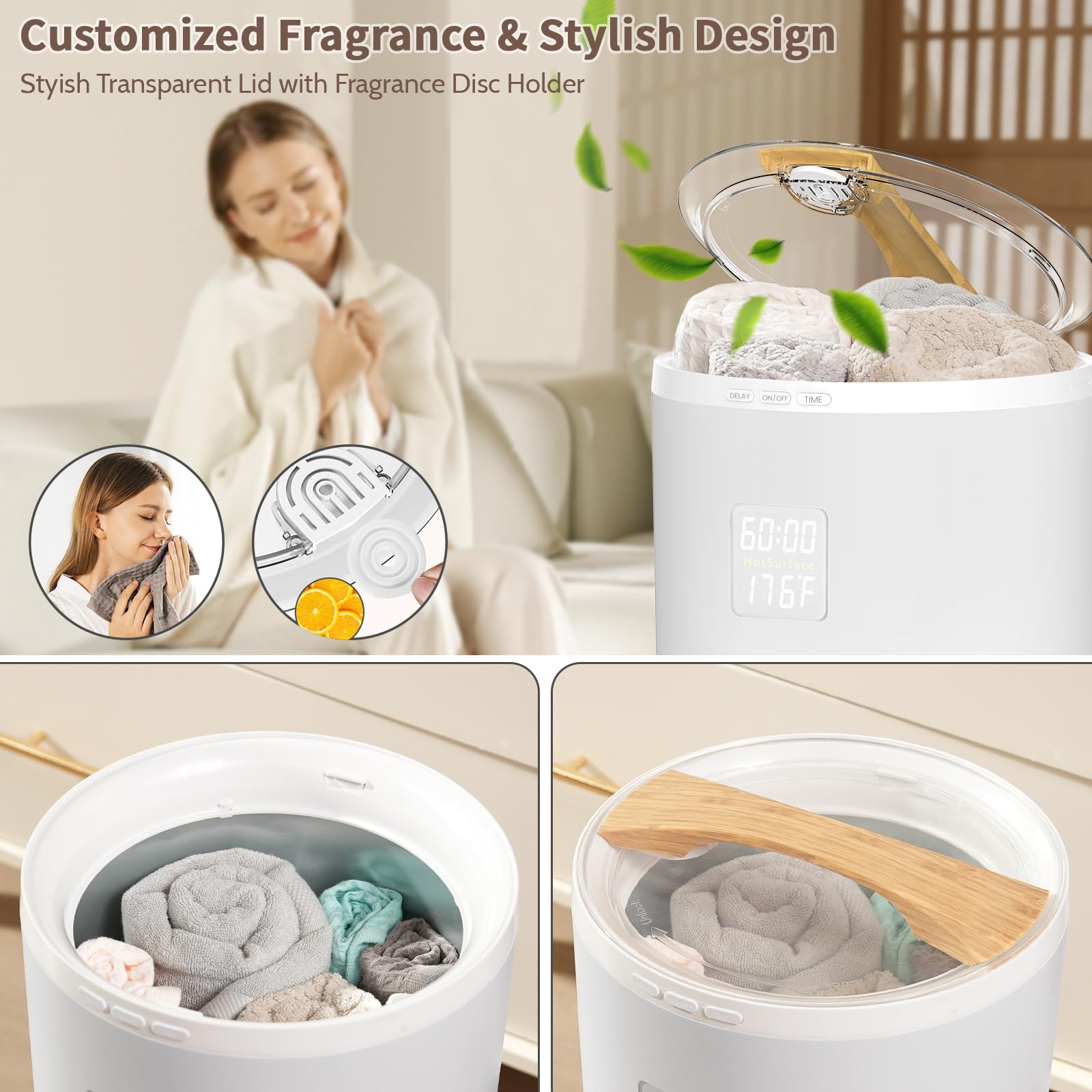 - Upgraded User-friendly Design: The hot towel warmer is designed with a chic stylish outlook to fit most household styles. Built-in cord storage in the base and the handle stand on the back help keep the extra-long power cord tidy when not in use. Features a fragrance disc holder, customize your own favorite flavor. Child safety lock ensures safety and ease of mind.