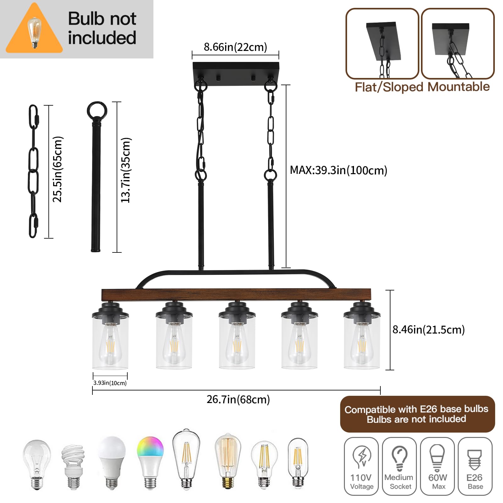 - Bulb Requirements: 5 standard E26 lampholders (bulbs not included), can be used with any E26 bulb, dimmable (buy dimmable bulbs separately).