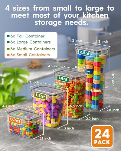 - 【Multiple Size】Kitchen storage container set comes in 4 different sizes, from large to small, 6 Tall Containers (2.5qt /2.8L), 4 Large Containers (1.8qt /2.0L), 6 Medium Containers (1.5qt/1.6L), 6 Standard containers (0.7qt /0.8L), Perfect for storing baking supplies, cookies, cereal, sugar, oats, coffee beans, tea, nuts, spaghetti, pet food and other dry goods.