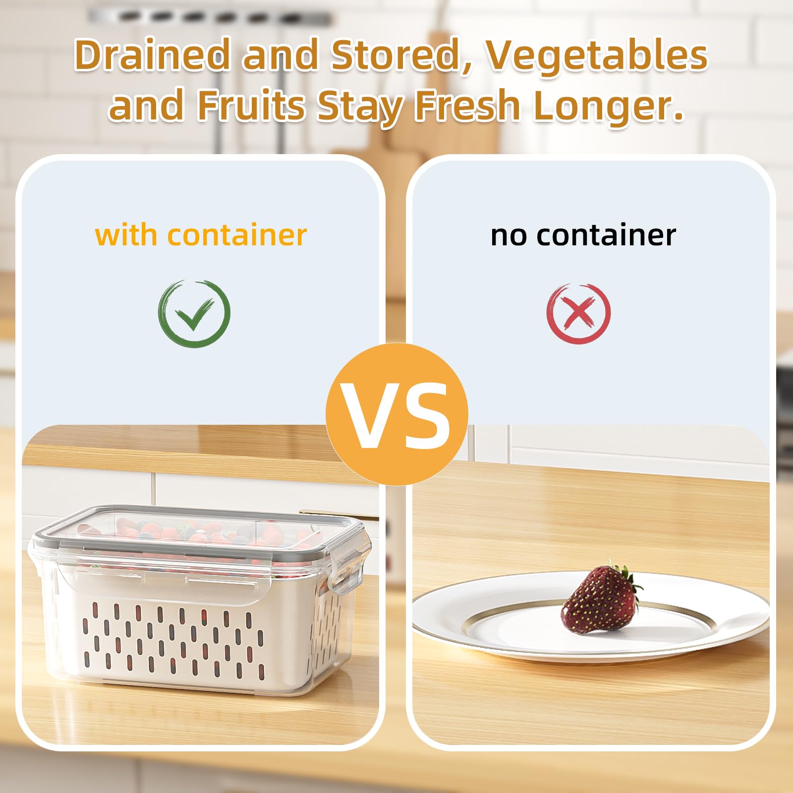- Longer Freshness Period: Each fruit and vegetable container comes with a removable drain strainer basket that allows for easy cleaning and quick draining of water from the surface of berries and vegetables, preventing spoilage due to over-soaking and prolonging the freshness of your food.