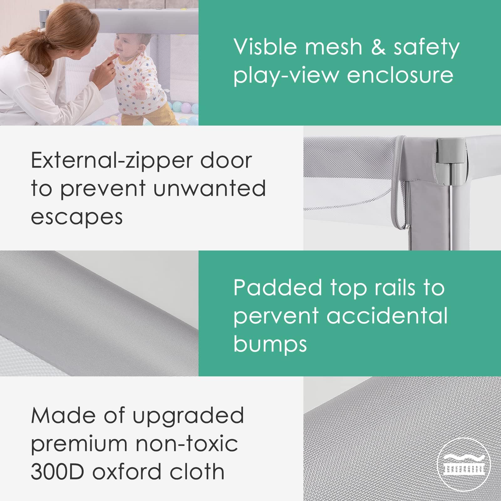 - [Upgraded Zipper Gate] Our baby playpen for babies and toddlers use upgraded 2 hang-able zipper gate (Most gate on the market is on the bottom), which can prevent baby from tripping over the door but also prevent the baby running out from the baby play pen active. The baby playpen foldable is also provide 360° all-vision, you are able to see the baby without having to be close up. Whether you're in the kitchen or the living room, you can always monitor your baby's activities with ease
