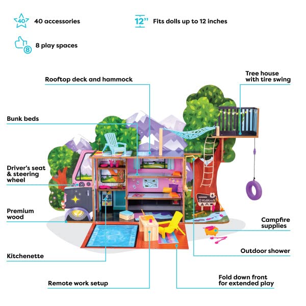Details: Experience nature with the ultra-cool KidKraft Glamp & Go 2-in-1 Doll Camper. This fold-out dollhouse sports magical unicorn graphics in a tree-lined, mountainous setting. Swing open the front façade and let all your 12-inch dolls enjoy the great outdoors. Inside, discover a kitchenette with sink and dual-purpose bunkbed/living space. There's even a steering wheel and driver's seat so dolls can take this party on the road. Enjoy remote work with the desk setup complete with laptop and chair. At night, climb up to the rooftop deck and relax in the hammock under the stars. A treehouse with tire swing is perfect for play time, while an outdoor shower and compost toilet provides the necessities of daily life. Set up the campfire and roast some marshmallows or take the fishing poles to catch some dinner. Made of wood, this camping van is ready to last through many years of adventures. This doll play set includes 40 accessories and play furniture pieces to extend the storytelling. Camping has never been as amazing as it is with the KidKraft Glamp & Go Doll Camper