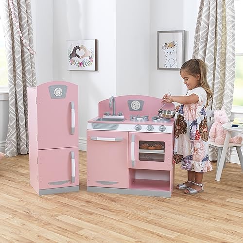 KidKraft Retro Wooden Play Kitchen and Refrigerator 2-Piece Set with Faucet, Sink, Burners and Working Knobs, Pink, Gift for Ages 3+