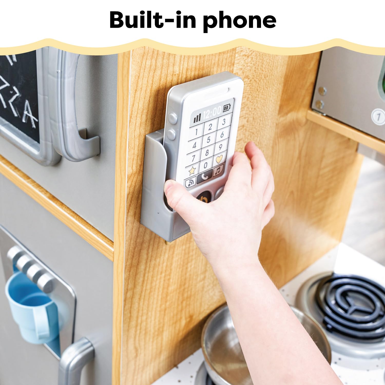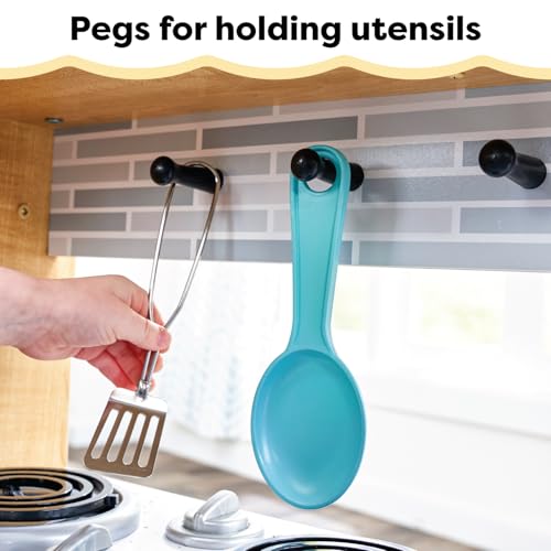 Time to cook up a little fun! Our KidKraft Uptown Natural Play Kitchen for kids has a hip, modern look that young chefs are sure to love. With tile-look backsplash and sleek countertops, the design is emulated from trendy real-life kitchens. Every appliance is interactive, including doors that open and close, knobs that turn and click and a working chalkboard on the freezer door. Your child will love taking calls on the cordless play phone that attaches to the side of the refrigerator. Keep all accessories neat and handy with the pegs for hanging utensils and the side towel rack. Made of wood, the Uptown Natural contemporary kitchen is a sturdy and stylish addition to playtime.