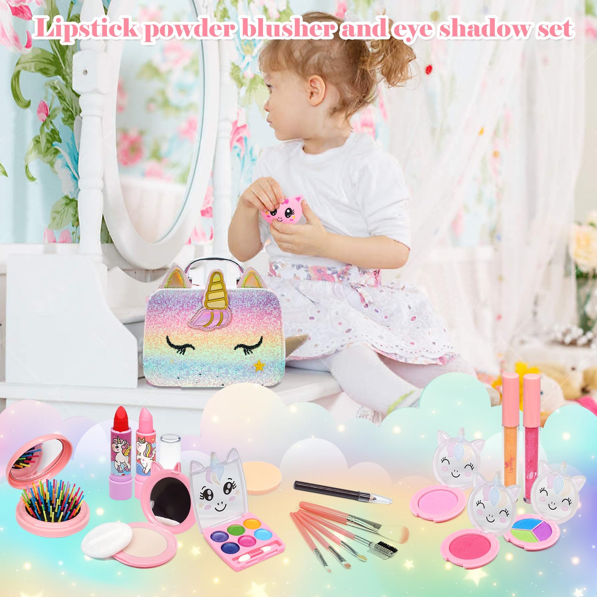 - Toddlers Makeup Toy With Kids Makeup Case: unicorn kids makeup case has a small mirror and a strap that can hold makeup brushes, just like a professional adults’ makeup case. The capacity is large enough for little girls to organize all of her make up set which won’t make a mess everywhere. Little girls could conveniently carry her beloved makeup kit to everywhere as well. Mom don't worry about what gift to buy for the little girl, just buy Mrabbitoo kids makeup kit for girls
