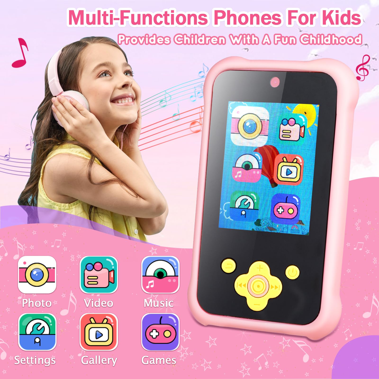 - 【Funny Puzzle Games & Powerful Battery Life】Kids Phone for Girls have 5 game modes to choose from.In the process of playing games,Kids can effectively exercise their logical thinking,reaction ability and hand-eye coordination ability. No longer have to worry about children being bored at home.Kids phone can continuously can be used for 2-3 hours after being fully charged! Phones for kids comes with a USB Type-C cable and an 32GB SD card,Can create more storage space for your pictures and videos.