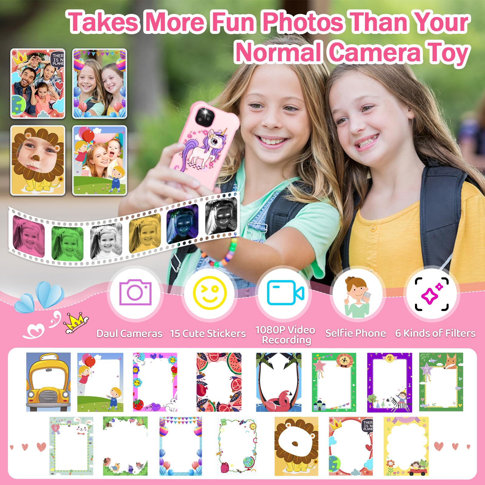 - 【180° Flip Camera with Three Camera 】Kids Phone adopt the 2023 newest upgraded 3 camera configuration,The toy phones for kids have features front and rear cameras with 15 cute cartoon frames and 6 filter modes,It can make kids more enjoy the process of taking pictures.kids can switch between their favorite cartoon frames/filter modes.The Kids Phone also Include the portable lanyard is so easy to carry and move.Kids Phone also includes a video recorder, take photos,MP3 player,creative game,ect.