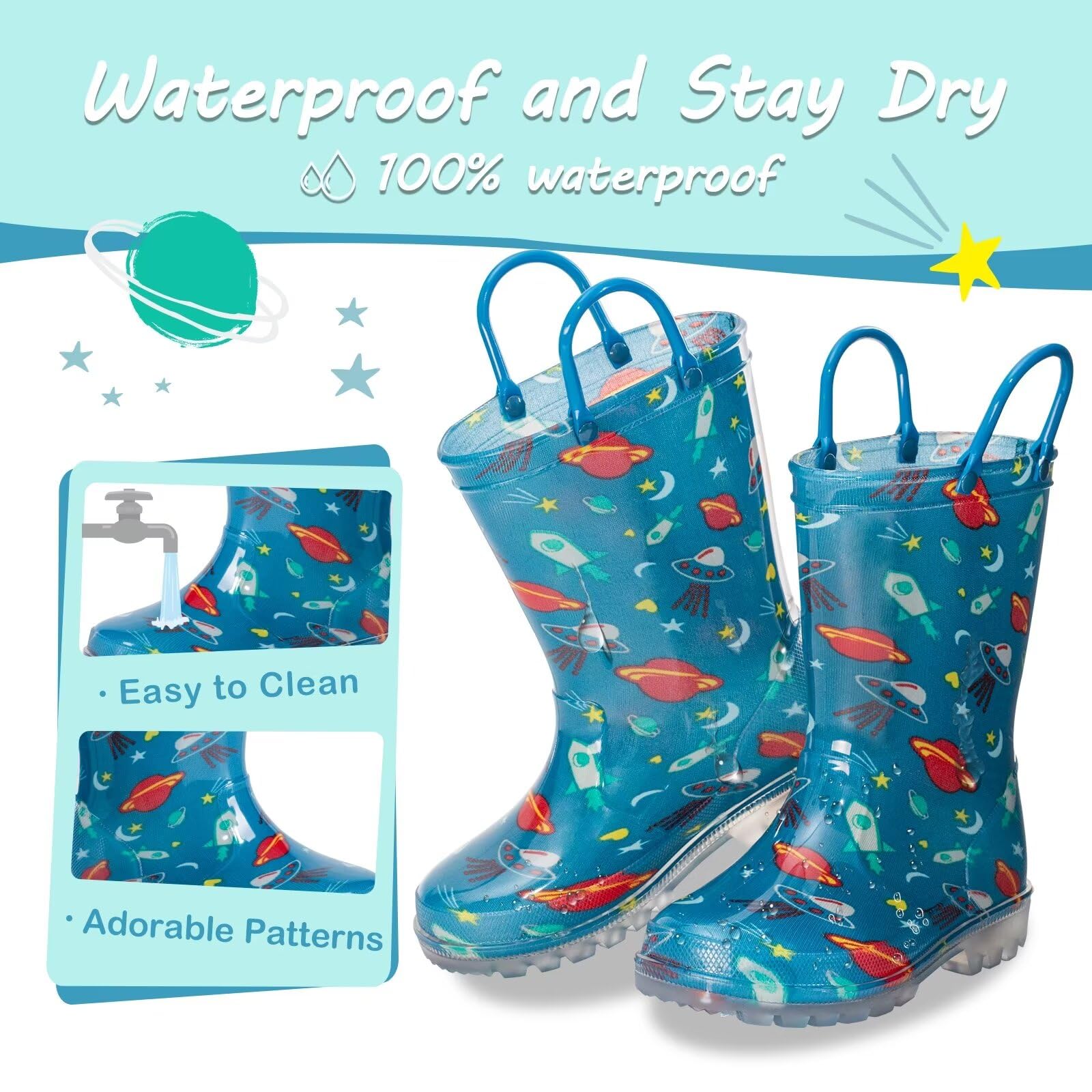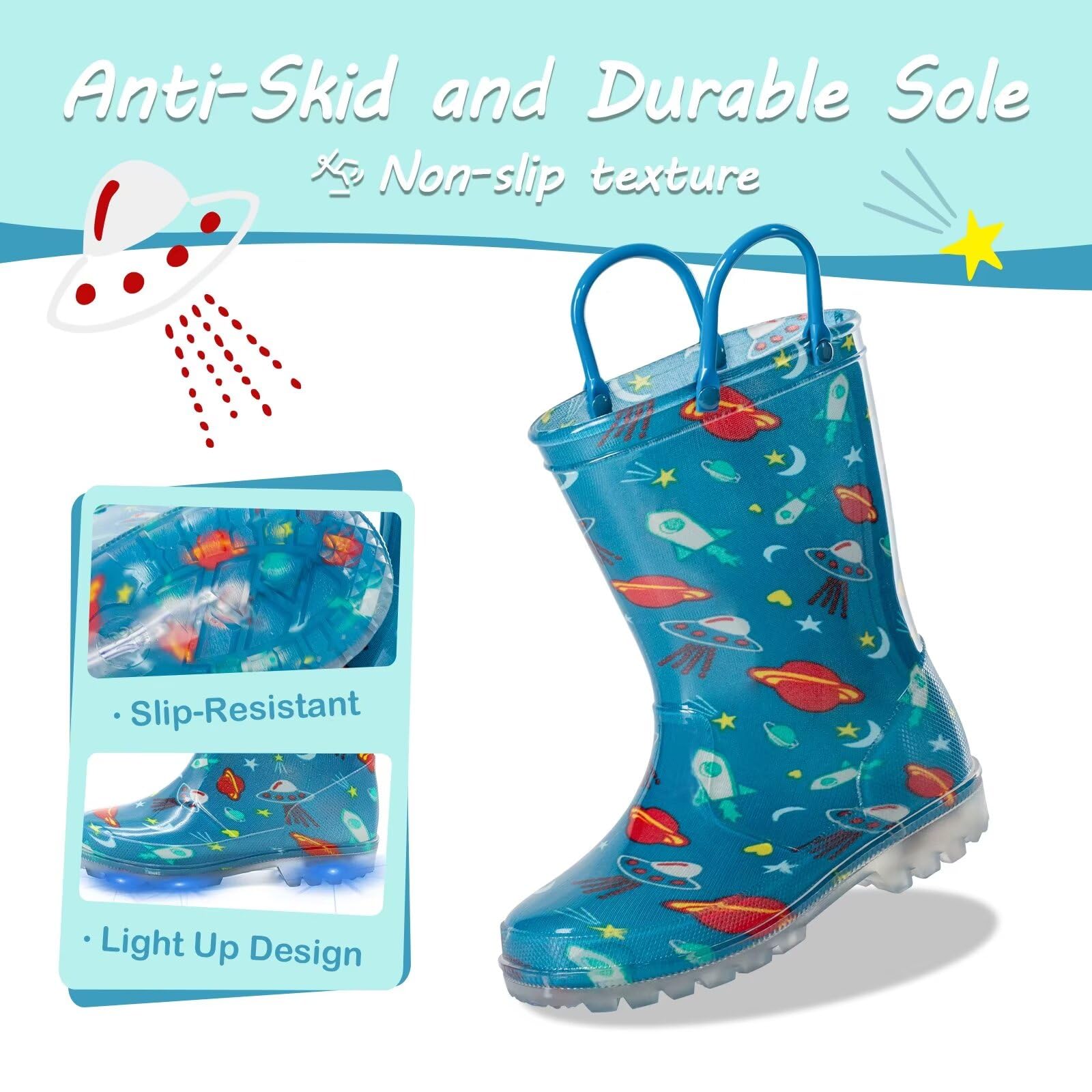 - PERFECT BACK TO SCHOOL GIFTS: Our kids rain boots are designed with fun patterns and light up design that can well match children’s personalities and styles, making them more attractive for kids to go to school and play outside on dark rainy days