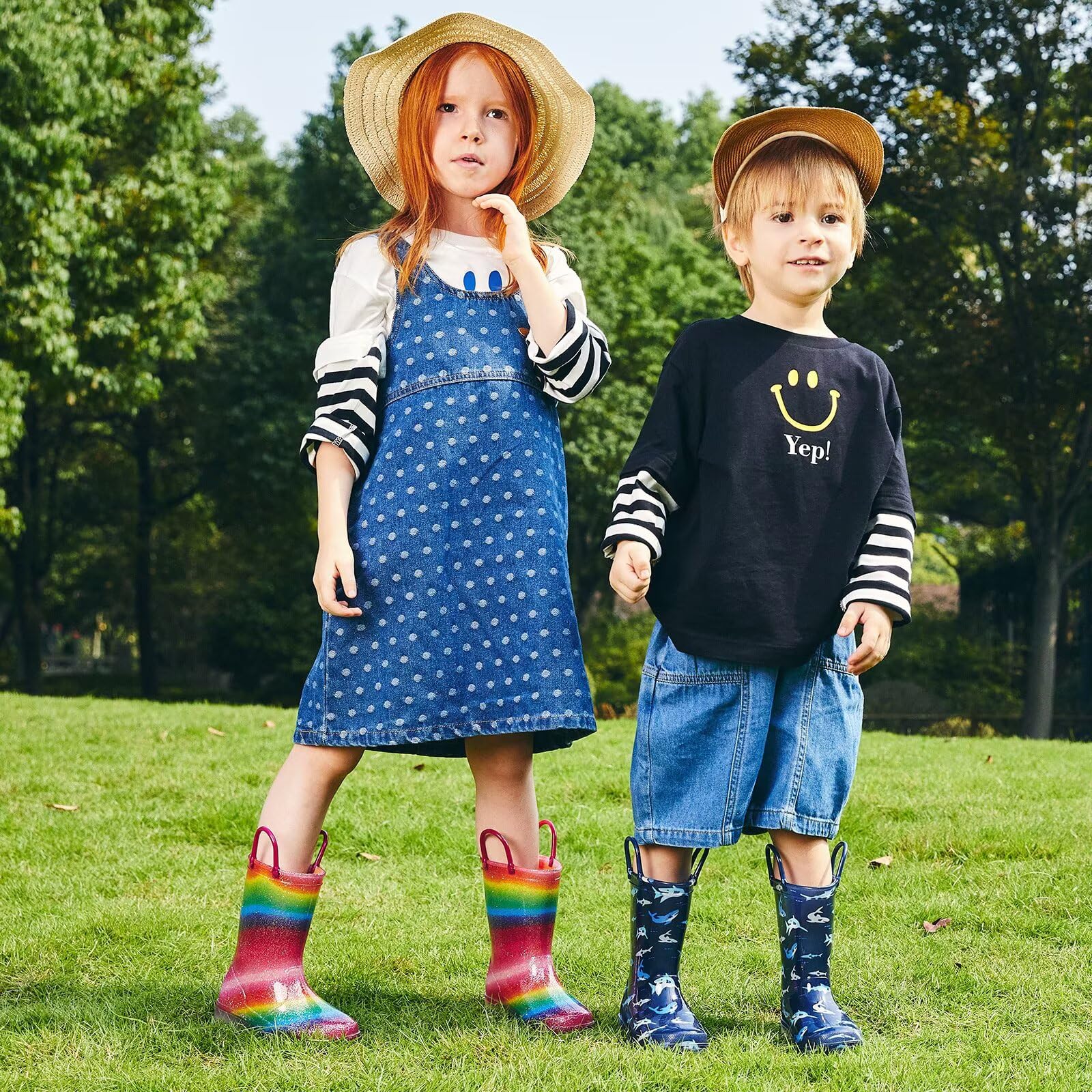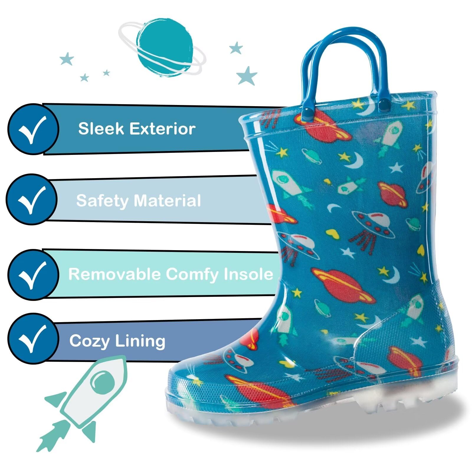 - SAFETY & CONVENIENCE: The anti slip outsole of our kids rain boots provides good traction on wet surfaces, keep safety for toddlers with no slipping. The durable handle design allows little kids to easily put on the boots with confidence