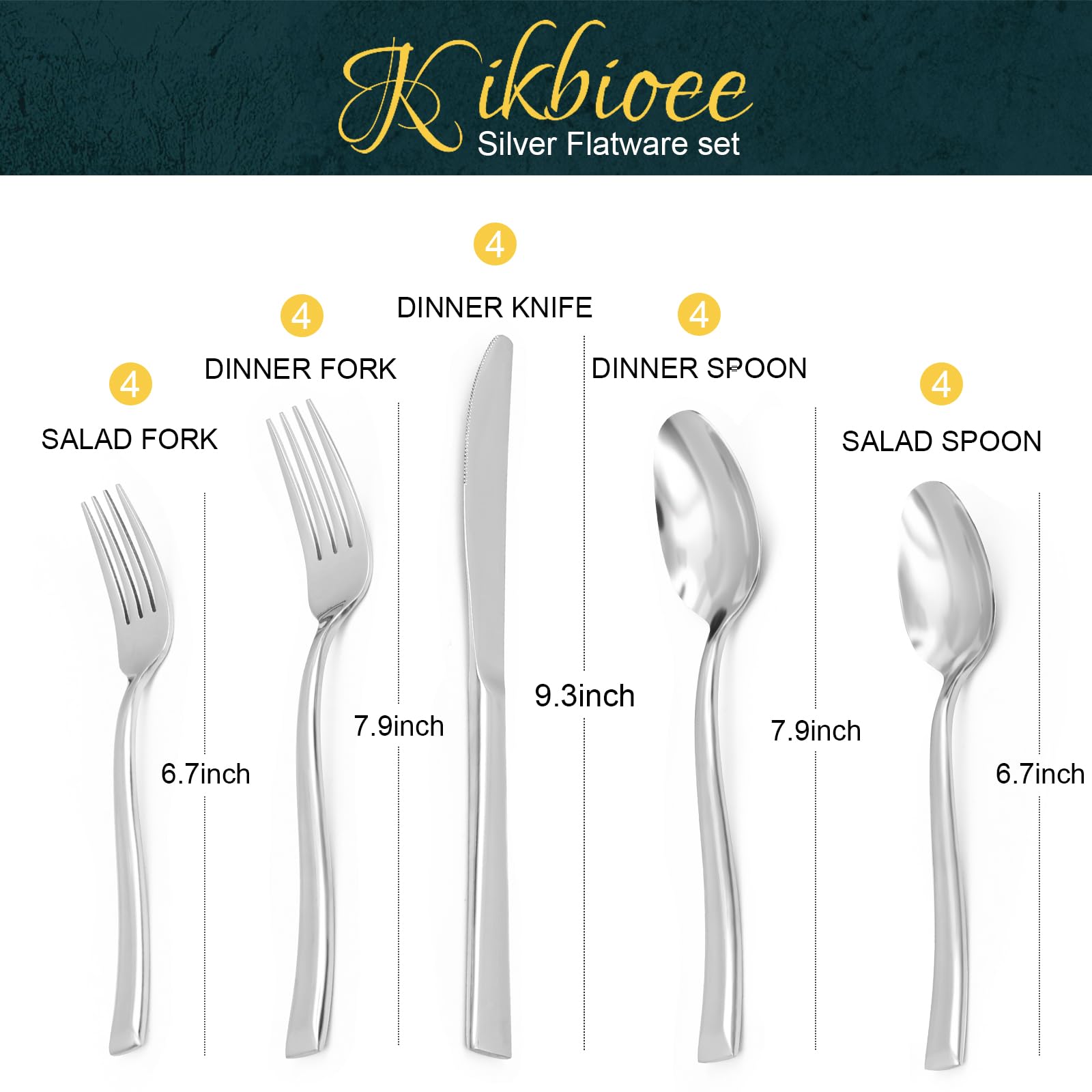 - 【20-PIECE SILVERWARE FOR 4】:20pcs stainless steel silverware set comes with 4 dinner forks, 4 dinner spoons, 4 dinner knives, 4 teaspoons and 4 salad forks.