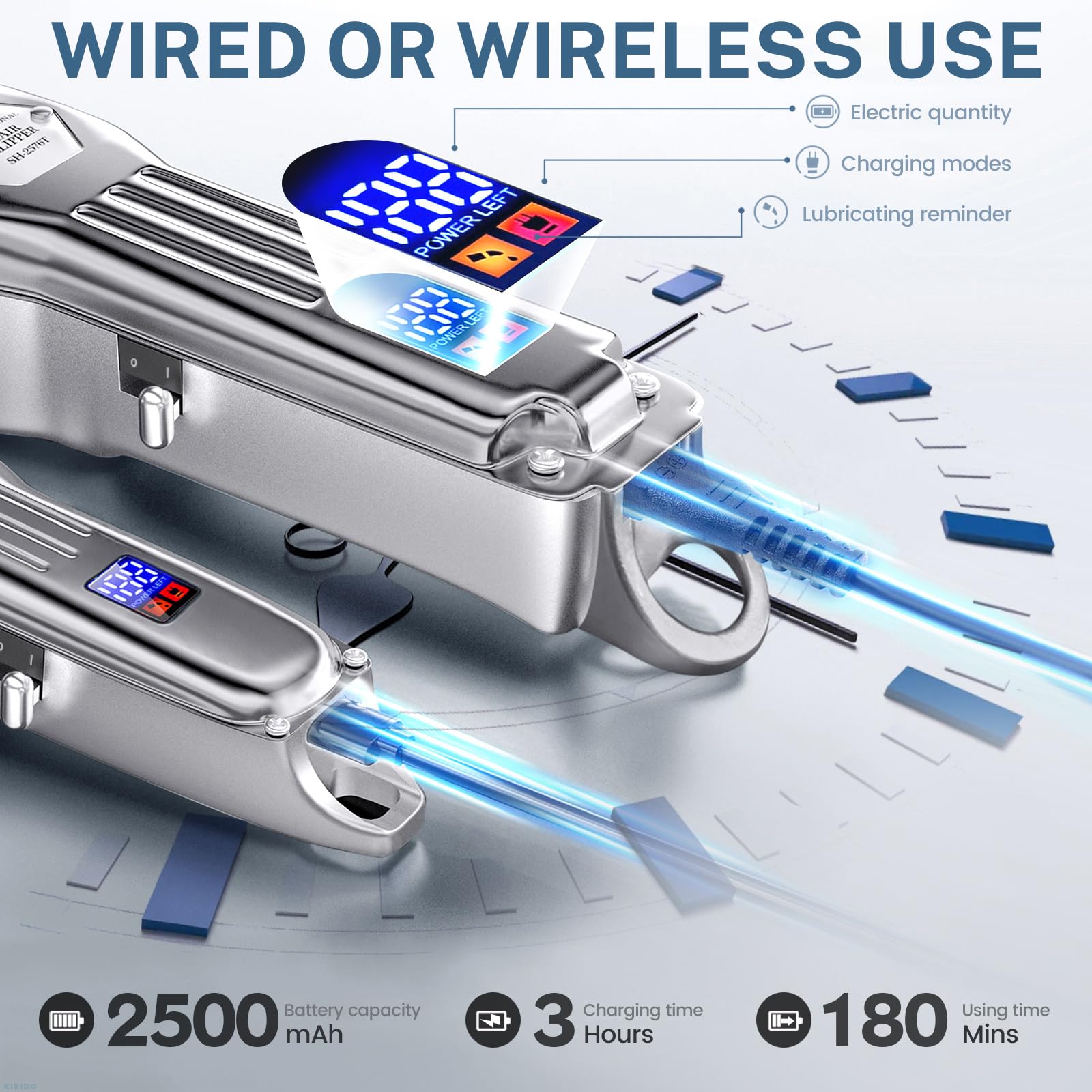 - LED Display and Ergonomic Handle: The built-in digital display allows you to quickly check power reminders, lubrication reminders, and charging status. The hair trimmer contains a high-capacity lithium-ion battery (2500 mAh), providing 5 hours of usage after 180 minutes of charging. These professional hair clippers are comfortable to hold, convenient to use, and easy to clean