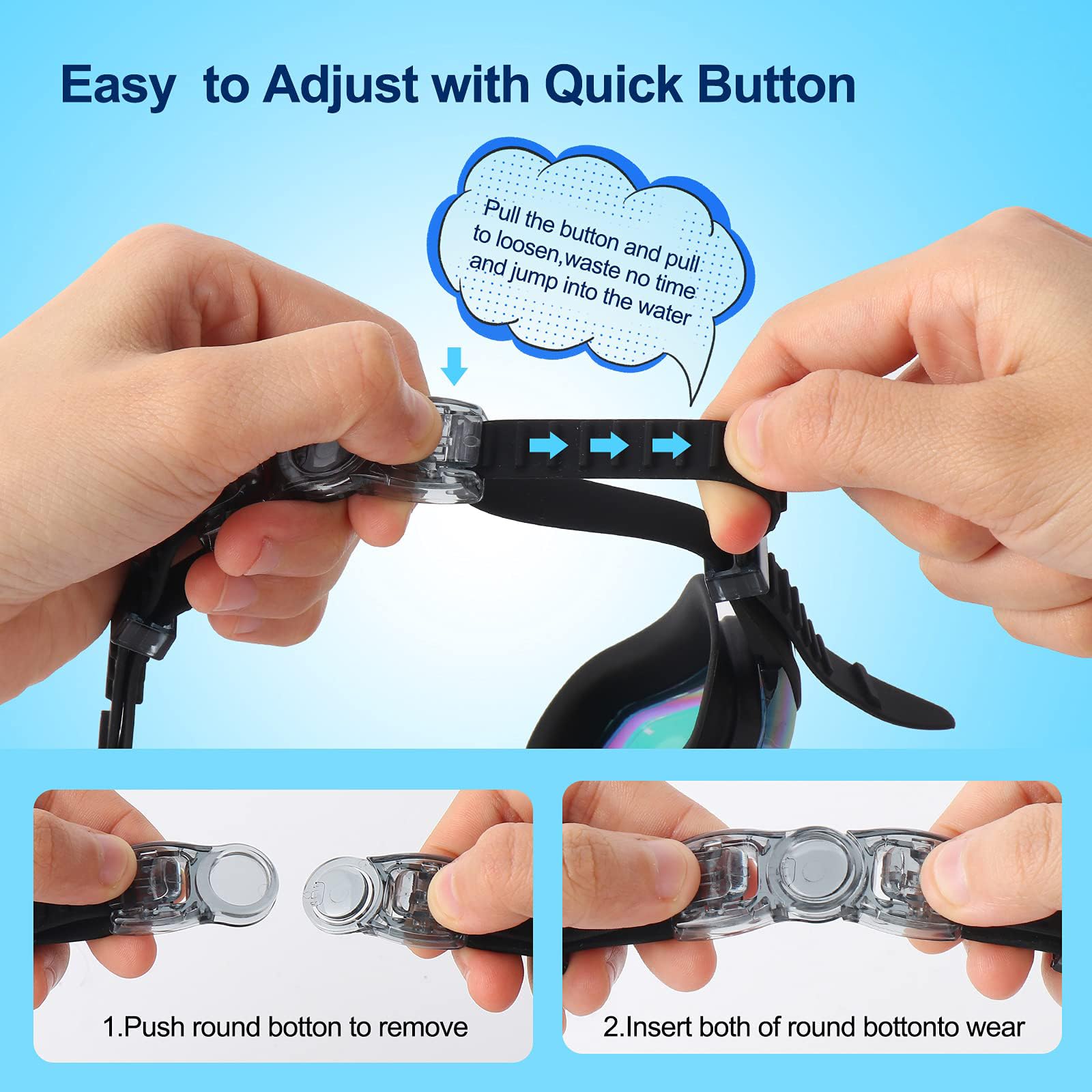 - EASY ADJUSTMENT: The quick adjust straps can be easily adjusted by kids or parents. Just press the clasp and pull the strap to fit. Well-designed clasp makes it easy to put swimming goggles on and off through one press without tangling children's hair.