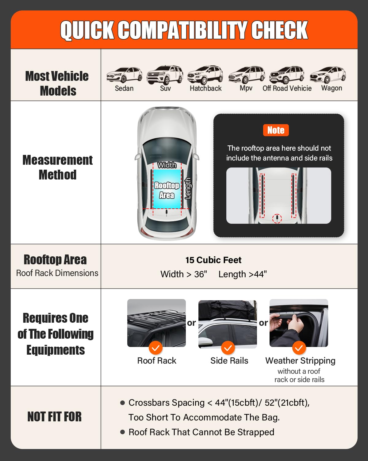 - Versatile Compatibility: Our Kimevan roof bag is compatible with a wide range of vehicles, including cars and SUVs. It works equally well with cars equipped with roof racks and those without, offering versatile usage to suit your needs.