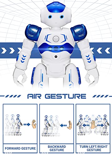 - šRemote Control and Hand Gesture Control : This gesture sensing robot not only can be controlled by infrared controller, but also can turn left ,turn right, slide backward, and slide forward according to how your hand gesture commands. Multi function includes auto display and obstacles avoidance as well. The toy robotās eyes light up with bright blue illuminating LED when it moves.