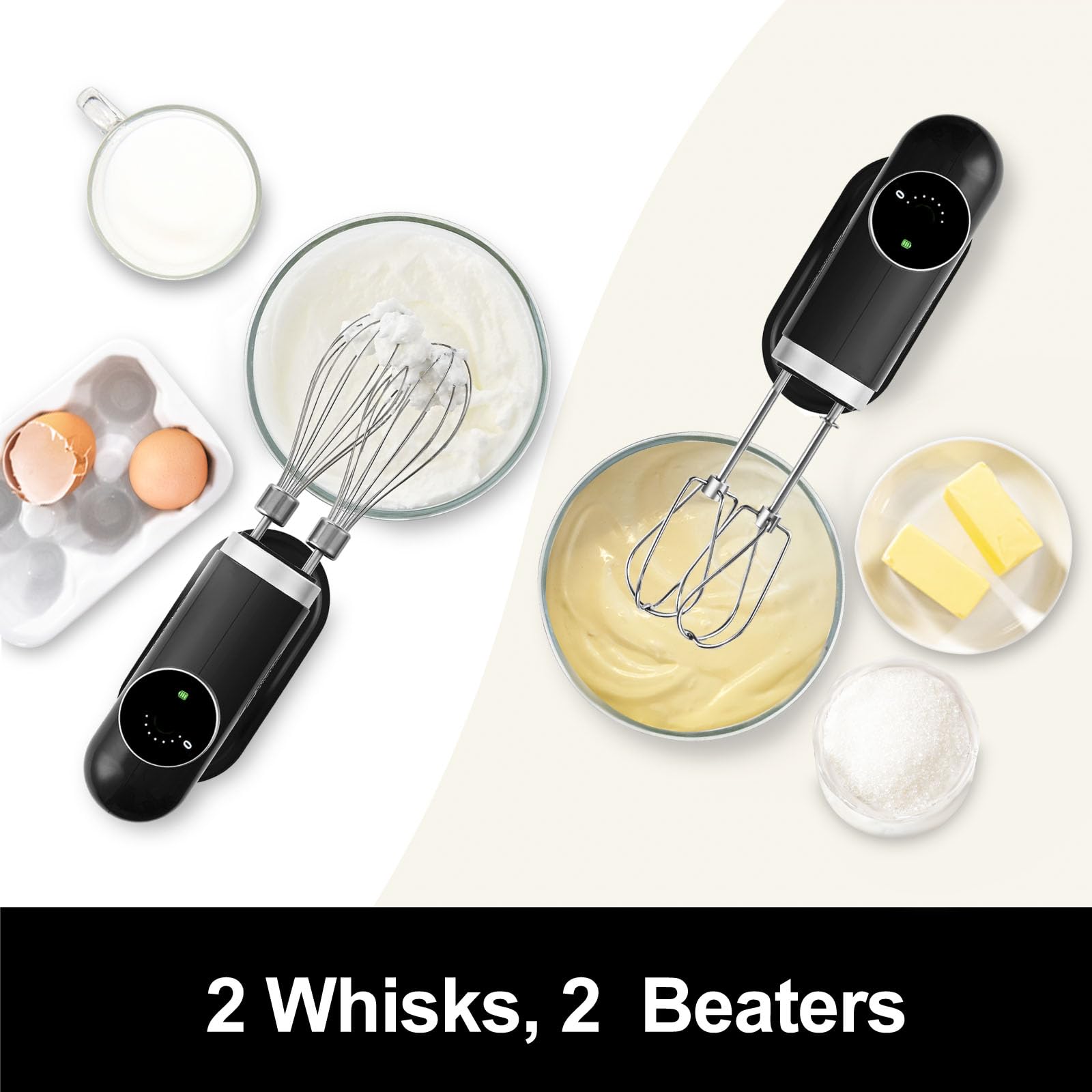 - 6-Speed with Digital Display & Knob Control - Electric lightweightd cake mixer, one click to open/off, A turn of the knob lets you easily change between speeds. The digital screen provides instant feedback for every speed change. The charge indicator will remind you to charge in time. It is suitable for mixing thin batter, softened butter, cream or egg whites. 6 Speeds to stir, mix, and whip all of your favorite recipes