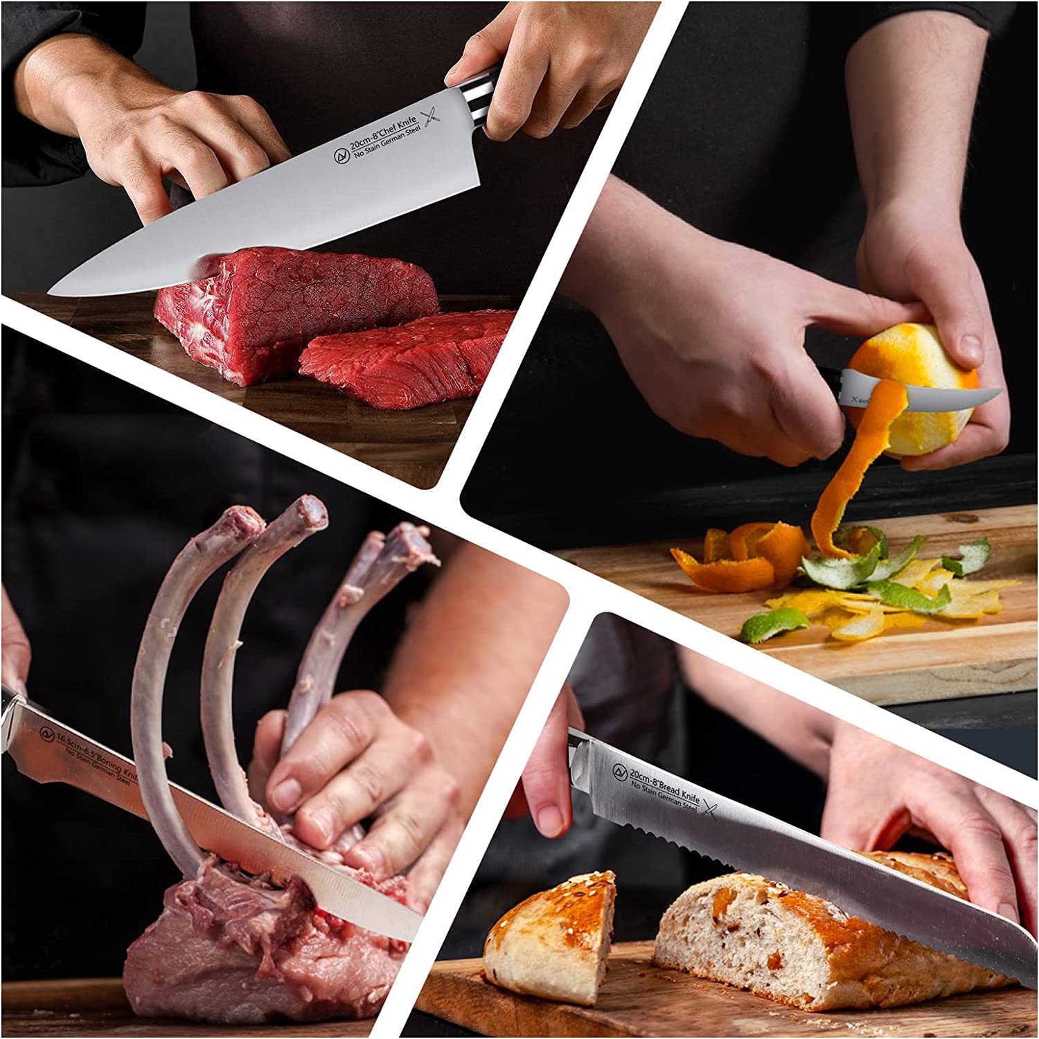 - NON-SLIP ERGONOMIC HANDLE - Kitchen chef knives set based on ergonomic design to ensure a minimization of use fatigue and a maximization of cut efficiency. Chef-approved design is perfectly balanced for comfort and control, so the knife feels like an extension of your hand.