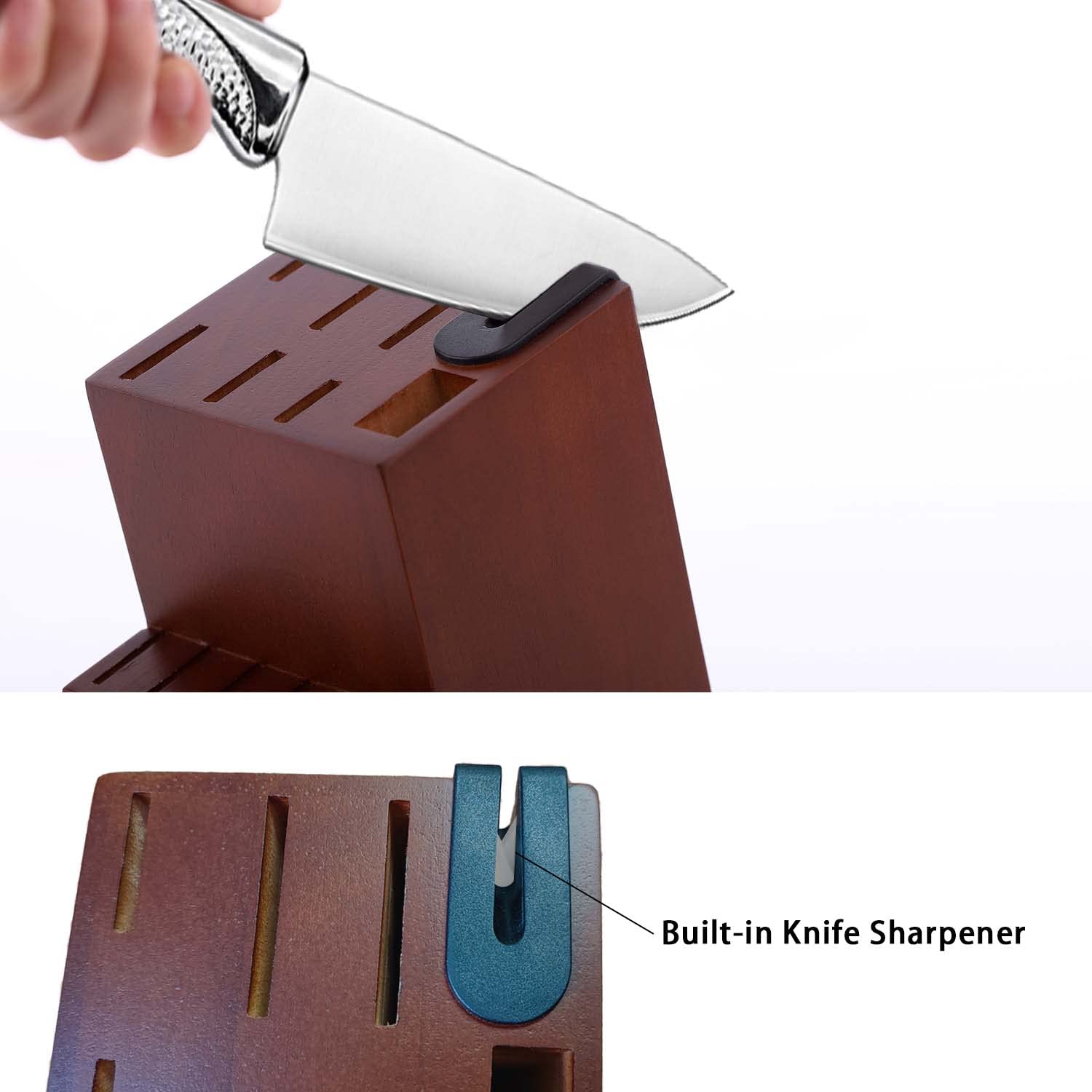 - High Grade Solid Wood Knife Block: All knives store safely in the high grade Solid Wood knife block with built-in sharpener for space efficient storage.