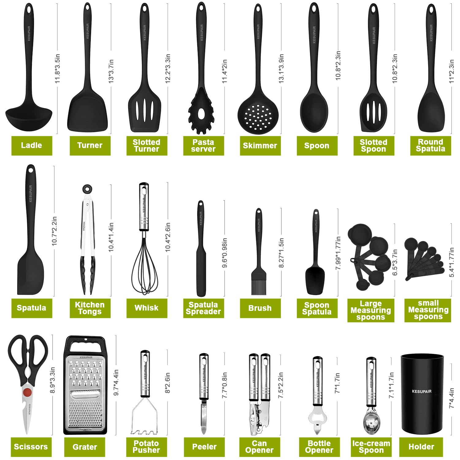 - Set Includes1xSkimmer,1xPasta Server,1xLadle,1xSpoon,1xSlotted spoon,1xSpatula,1xLarge Slotted Turner,1xSlotted Turner,1xTurner,1xBrush,1xSmall spatula,1xT spatula,1xHolder,1xPeeler,1xBottle Opener,1xPotato Pusher,1xIce-cream spoon,1xCan opener,1xWhisk,1xTongs,1xGrater,1xMeasuring cups,1xMeasuring spoons,1xScissors
