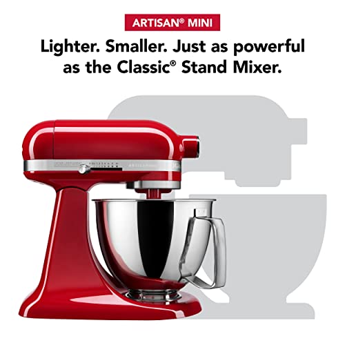 Details: Lighter. Smaller. Just as Powerful.* When you still need the power but don't quite have the space, the KitchenAid® Artisan® Mini Tilt-Head Stand Mixer can whip up the recipes you love without taking over your kitchen counter. This durable tilt-head stand mixer was built to last, and can mix up to 5 dozen** cookies in a single batch. It features 10 speeds to gently knead, thoroughly mix and whip ingredients for a wide variety of recipes. Whether you're craving fresh guacamole, gently shredded pulled pork or a single, flavorful pan of meatloaf, the Artisan Mini can help you create a variety of small-batch, hand-crafted possibilities. Get creative and make more with your mixer with over 10 optional hub-powered attachments***, from food grinders to pasta makers and more. *Compared with the KitchenAid® Classic™ Stand Mixer. **Using the flat beater; 28g dough each ***sold separately.