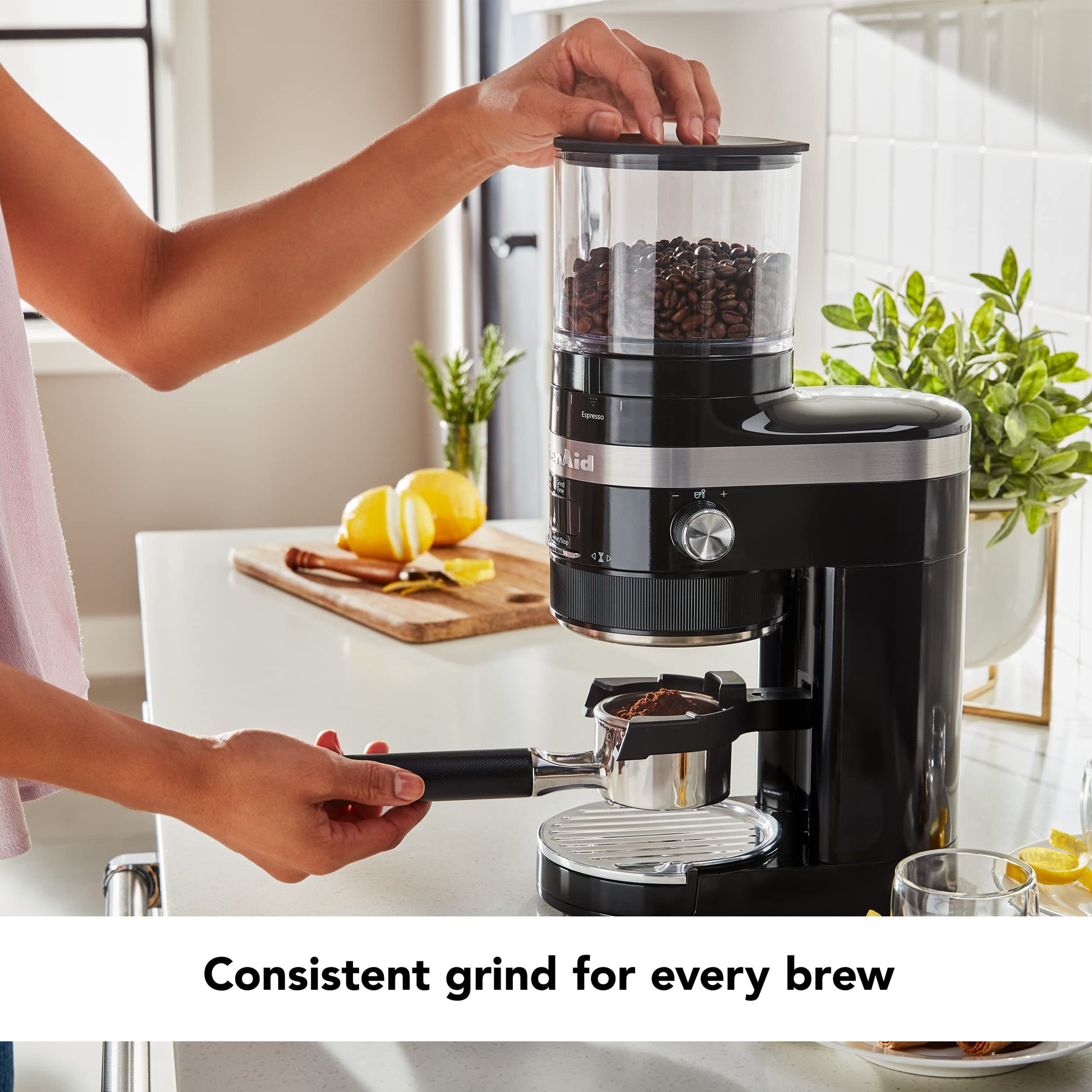 - Getting consistent grind size means delicious brewing every time. Achieve consistent grind sizes for all brew methods from French Press to Espresso with the KitchenAid Burr Coffee Grinder.