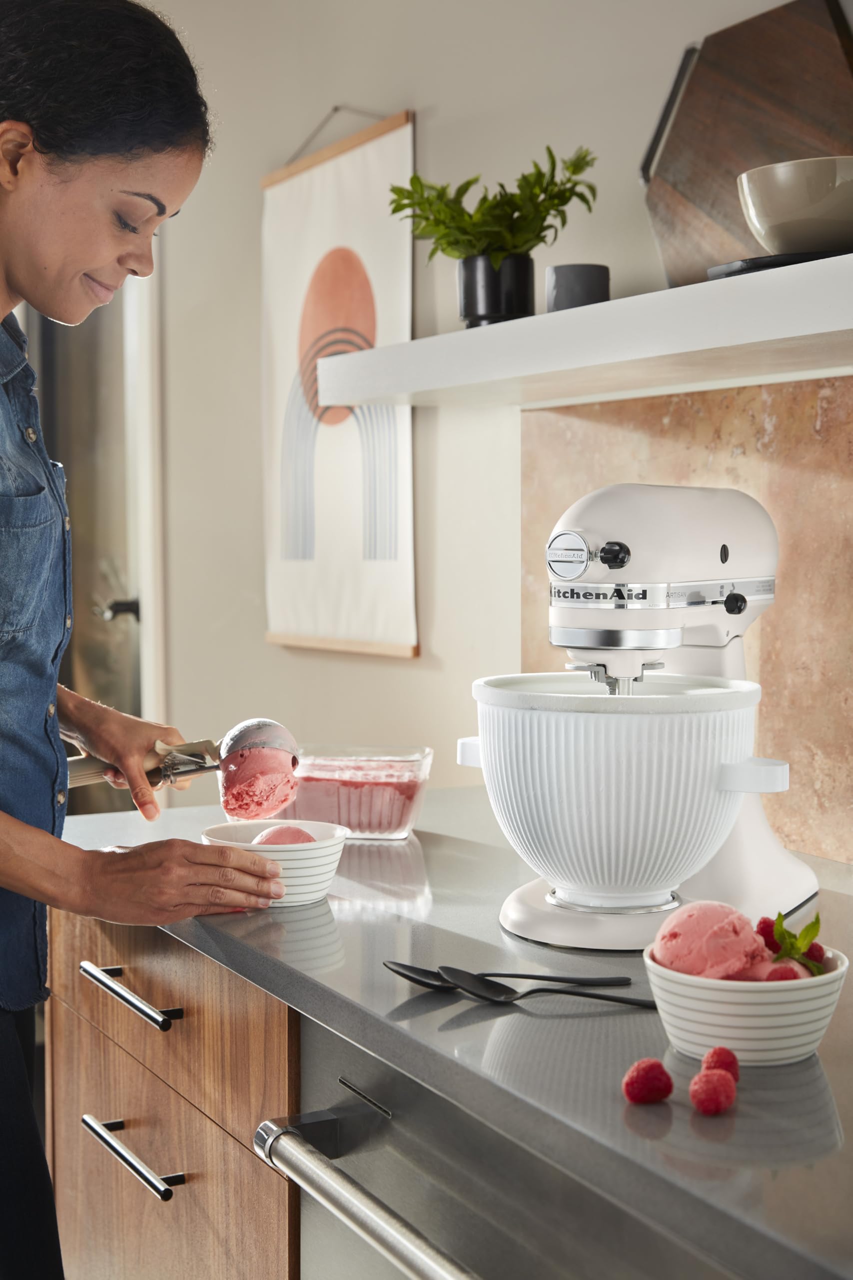 Details: Are you planning an ice cream sundae bar for a party this weekend, or do you need a scoop of vanilla bean ice cream to top your freshly baked dessert? It's so easy to make ice cream, sorbet or gelato with the KitchenAid® Ice Cream Maker Attachment. Simply attach the bowl to the base of your household KitchenAid® Stand Mixer* to quickly and easily make up to 2 quarts of your favorite frozen treats at home. *Sold separately. Fits all KitchenAid® Tilt-Head Stand Mixers, except Artisan® Mini models - KSM3316 and KSM3317. Fits all KitchenAid® Bowl-Lift Stand Mixers, except the following 5, 5.5 and 6 Quart models - K5SS, KSM50, KSM500 and KSM450.