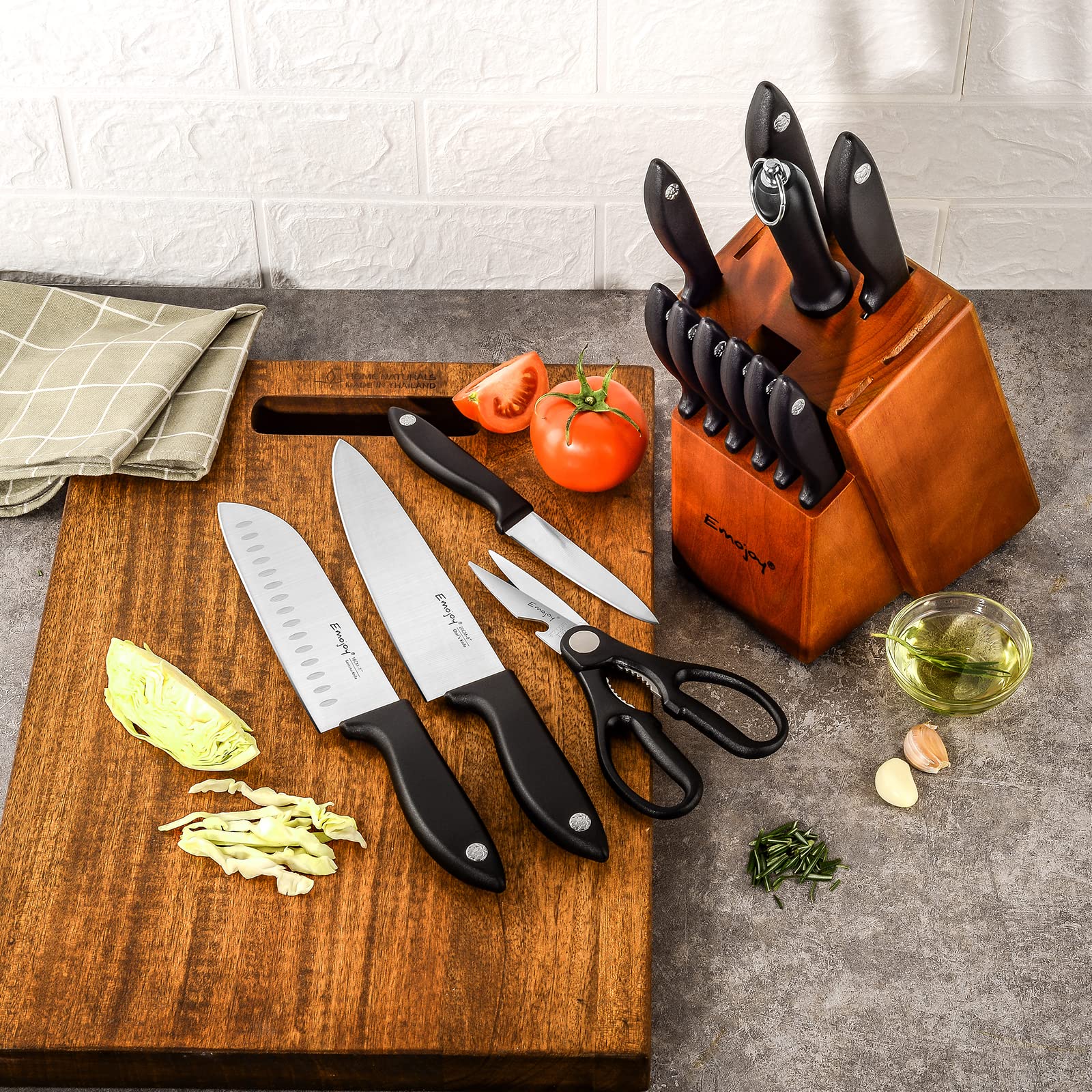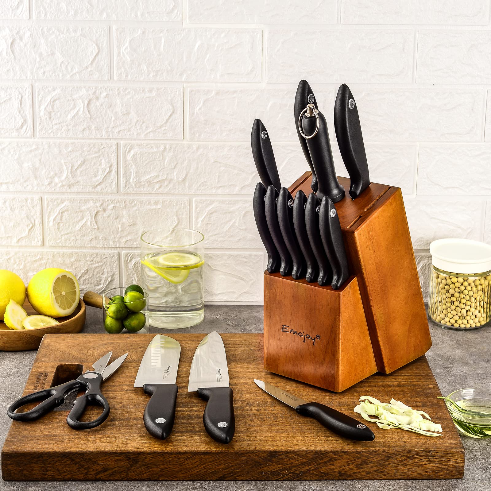- 【A BEST GIFT】Emojoy was born for everyone loving cooking.Our knife set with block is more like every chef's best partner for any of your cooking needs. For the one you cared about, Emojoy kitchen knife sets with block it's also a wonderful wedding gift for your friends or Mother's Day ,birthday,housewarming,Thanksgiving,Christmas and any other events.