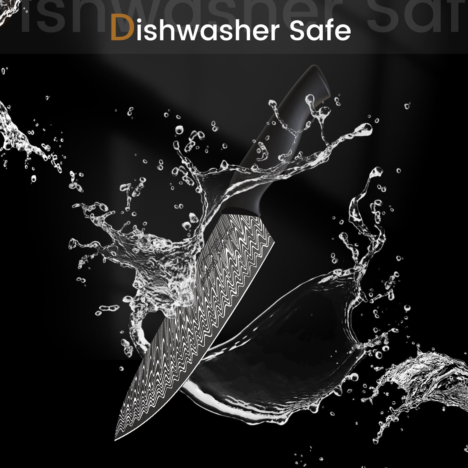 - 【Dishwasher Safe】 Each knife is dishwasher tested 999 times. Exclusive patented anti-rust technology ensures that they remain in the best condition after intense rinsing in the dishwasher.Enjoy the pleasure of cooking and then easily restore your kitchen to a tidy state.