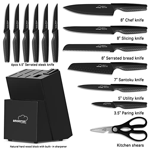 - 【All in One Knife Set】15 pieces knife set includes: 8" Chef knife, 8" Slicing knife, 7" Santoku knife, 8" Serrated bread knife, 5" Utility knife, 3.5" Paring knife, 6 Pcs 4.5" serrated steak knife, 1 Pc kitchen shear, and Black hard wood Knife Block with built-in Knife Sharpener.