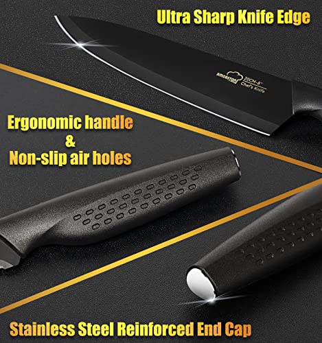 - 【Sharp, Non-Stick & Rust-Resistant】Black kitchen knife set uses a unique anti-rust, anti-stick and anti-oxidant Teflon coating, so that the blade is always in the best condition, extremely easy to clean, greatly extending the life of the knife.