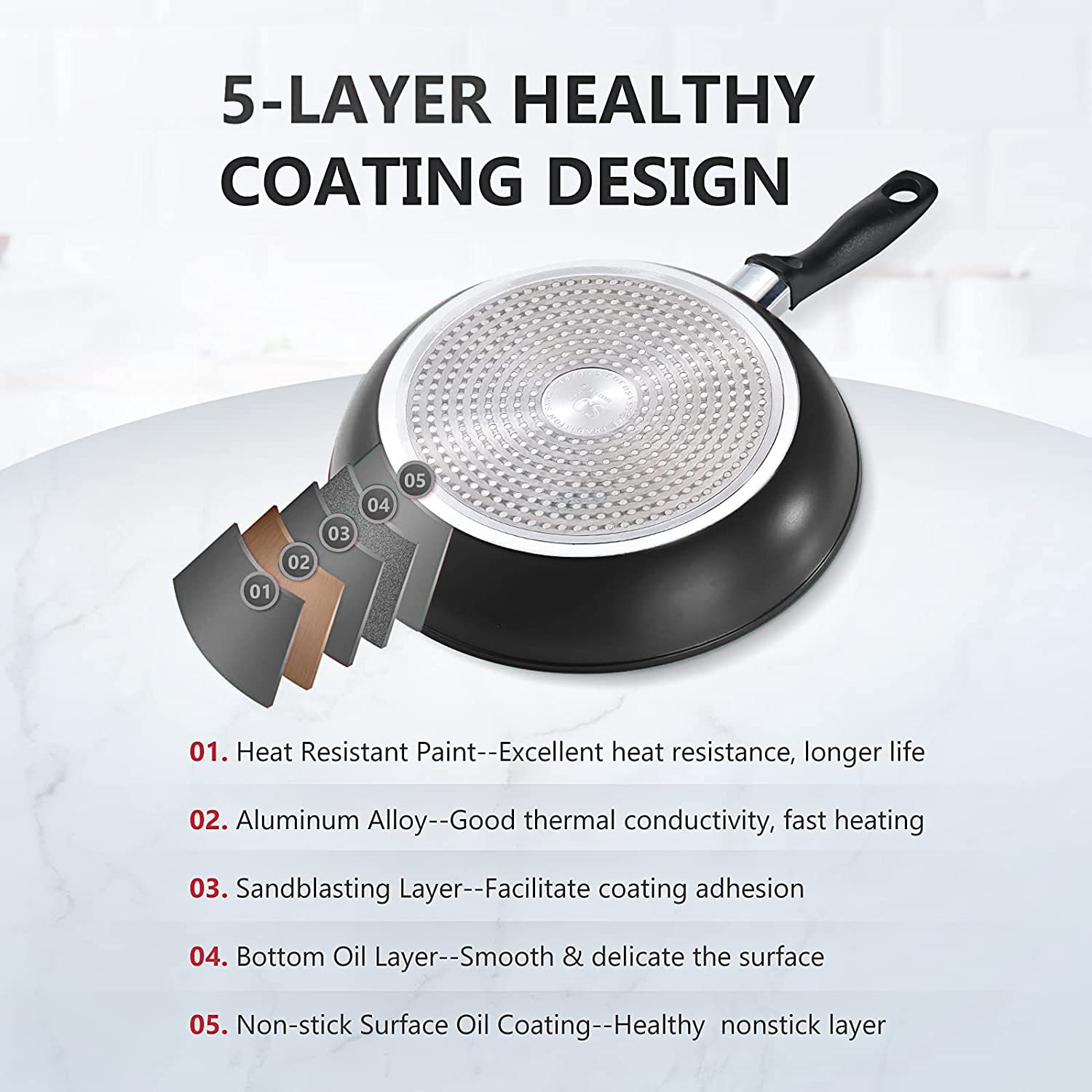 - 🍲[Non Transparent Coating & Healthy Materials] - This black frying pan is made of five layers of 100% APEO and PFOA free materials. A white ceramic coating on the surface ensures its non stick properties. The inner part of the four layers is made of aluminum alloy, which makes the frying pan heat evenly and more resistant to high temperature. Every time you cook with this frying pan, you don't have to worry about your health.
