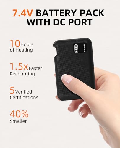 - π₯πππππππππ β 7.4V battery pack with DC port provides higher power output than USB port, ensuring more stable power supply and faster charging. 5000mAh capacity battery is compact in size and weighs only 6.7oz. The total weight of the battery and heated vest is 21oz, making it easy to wear under a jacket, over a sweater, or on its own without feeling bulky and annoying. It's a great layering piece. ππ¨οΌKODOKU heated vest has a separate battery pack purchase link.
