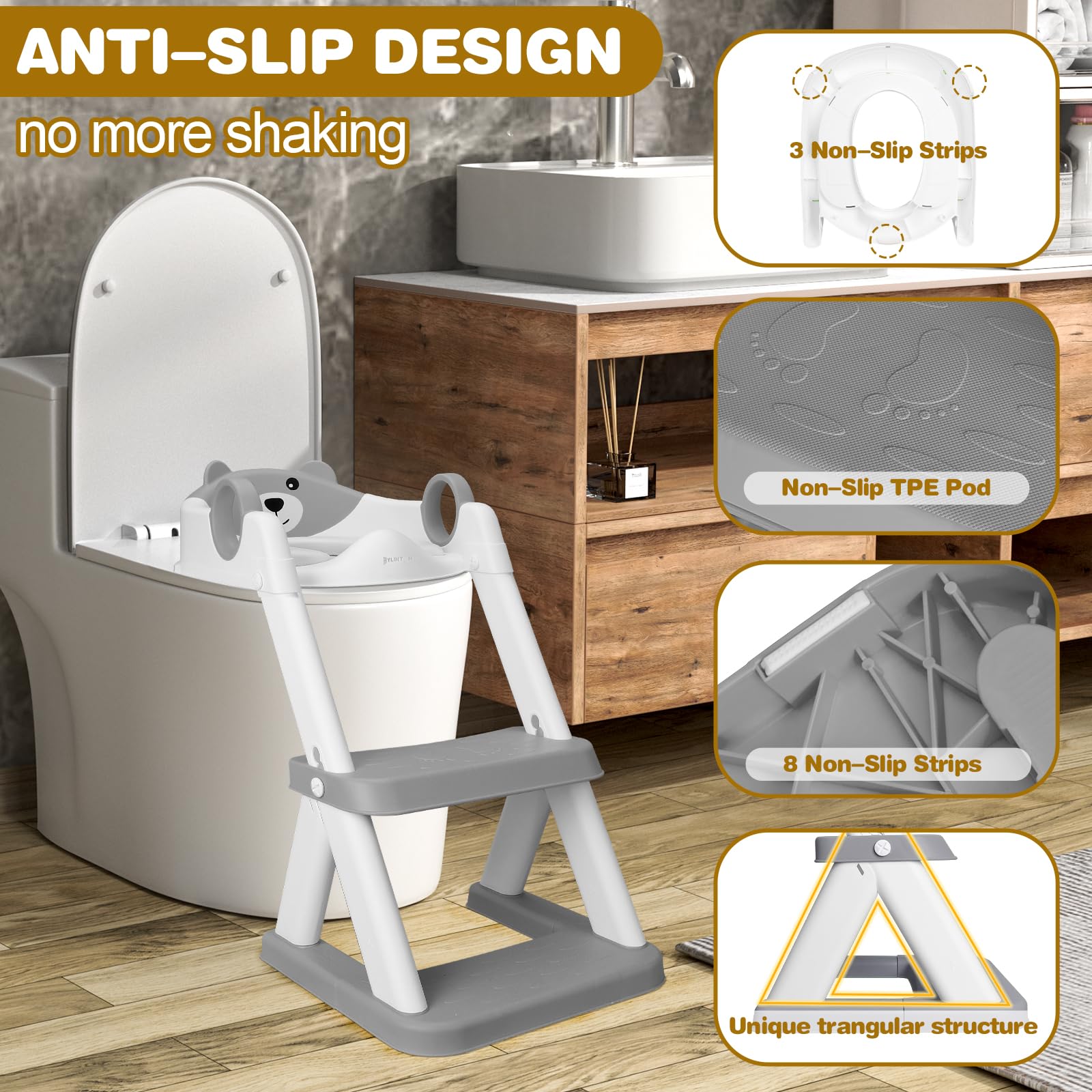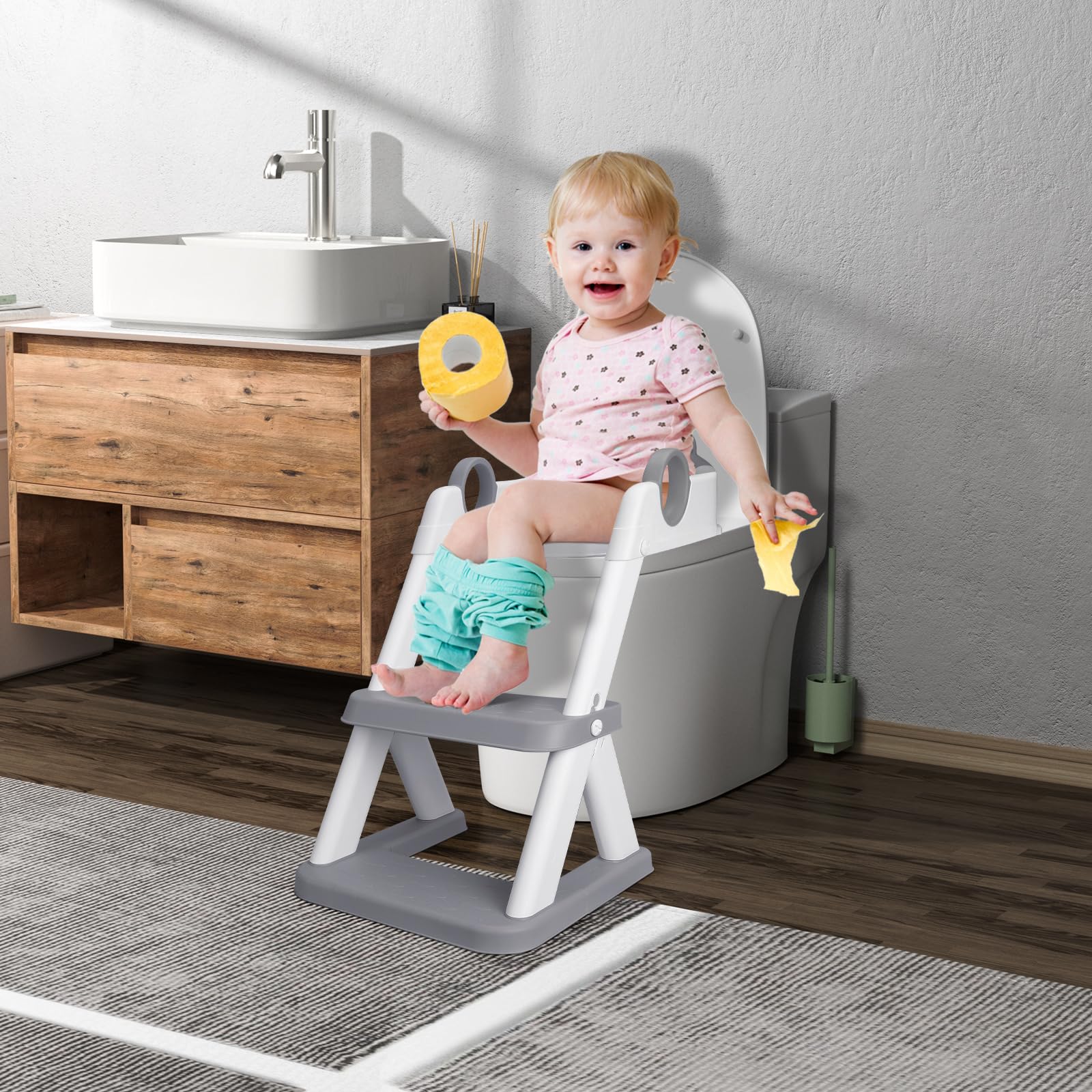Kylinton® Potty Training Seat with Step Stool Ladder, Foldable Toddler Potty Seat, Training Toilet for Kids, Splash Guard Comfotable and Anti-Slip Pad for Boys Girls - New Grey