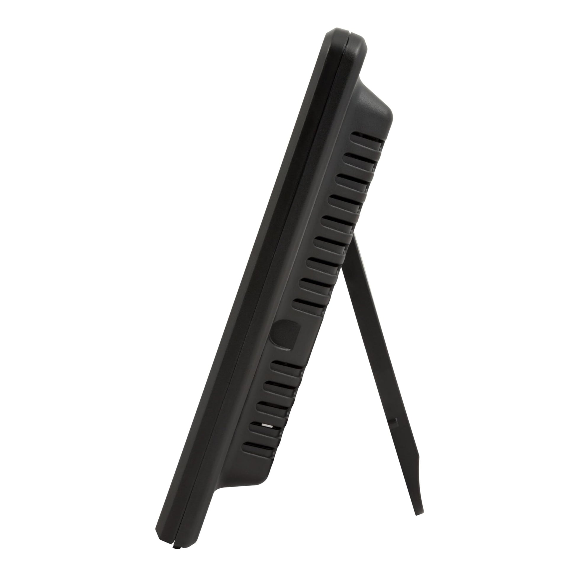 Details: Stylish atomic digital clock is packed with many features and offers modern look to add to your living room or kitchen. Outdoor temperature display receives wireless data from weather-resistant transmitting sensor over a 330 ft (100 m) range, down to -40 F. Large, 2 inch tall time digits set automatically to your time zone selection and adjust to daylight savings, all on an easy to read LCD with calendar display & moon phase. Clock indicates active alarm, WWVB signal, and low/weak battery with adjustable display language. Mount clock onto wall or fold-out leg stand to place on table.